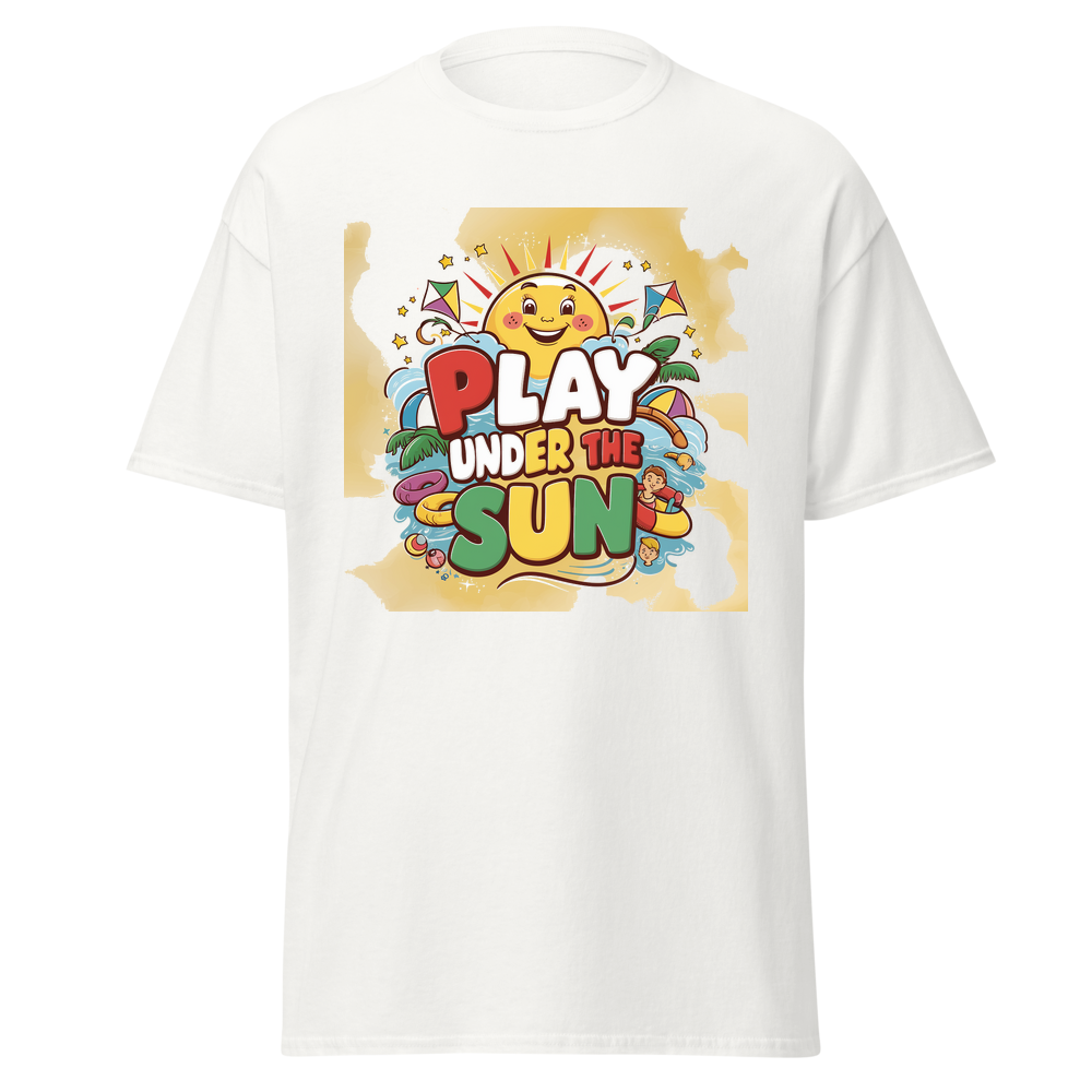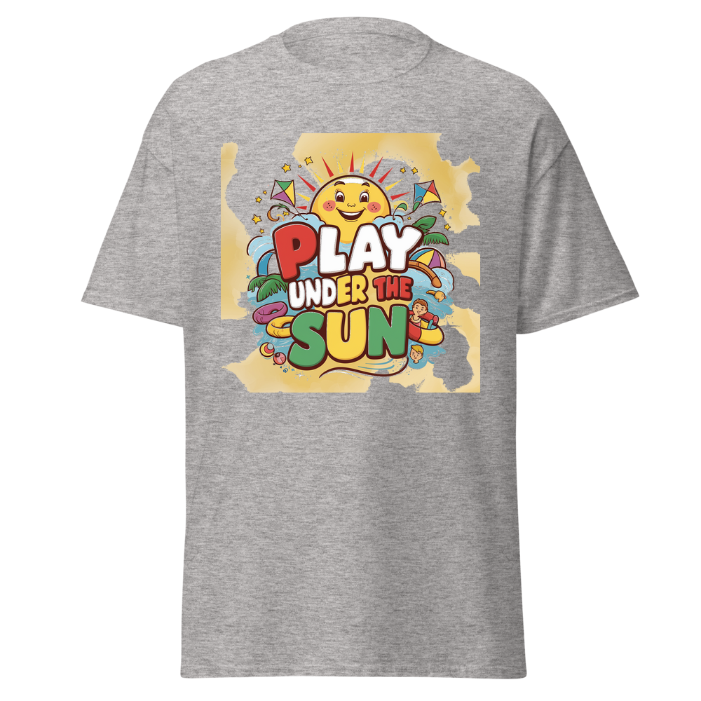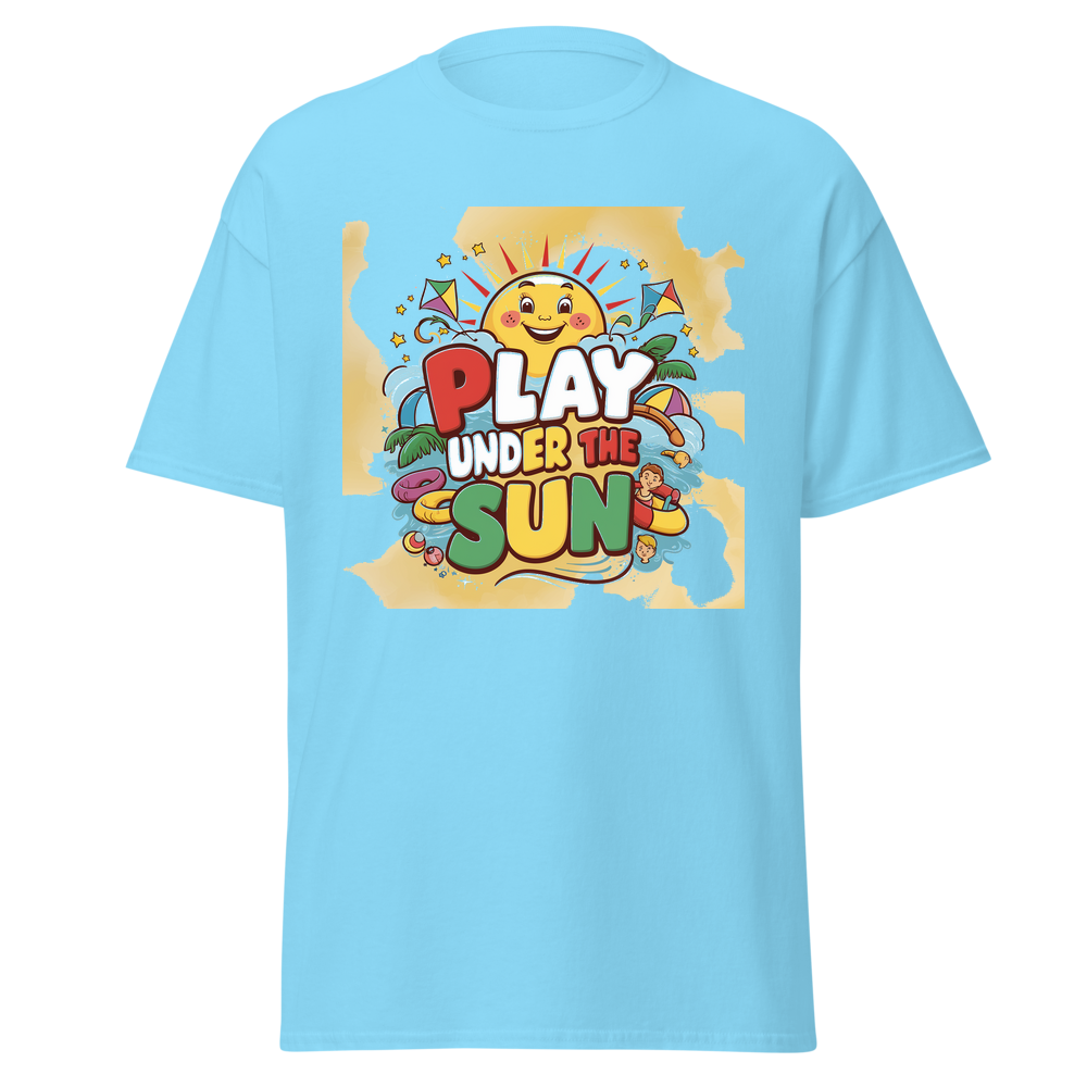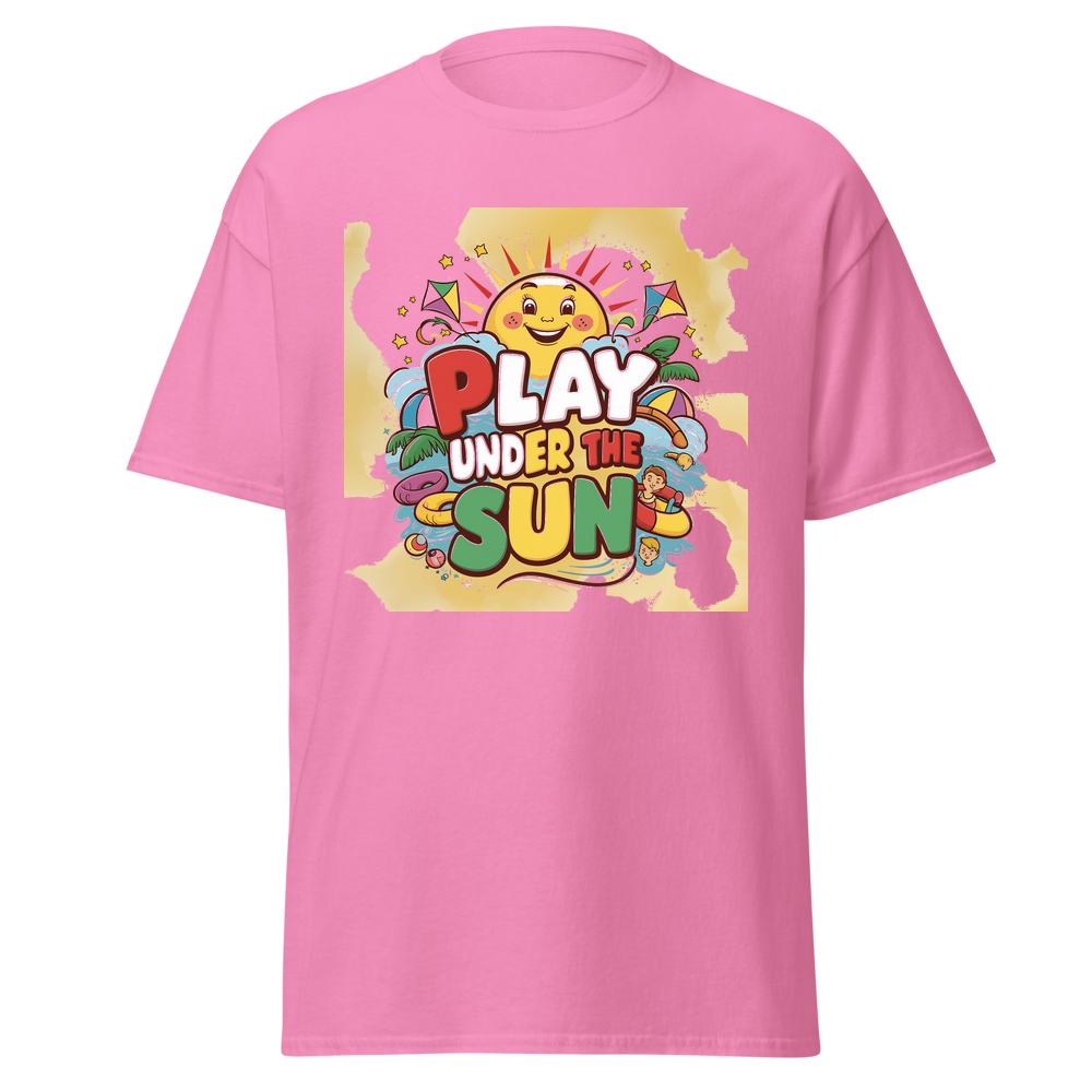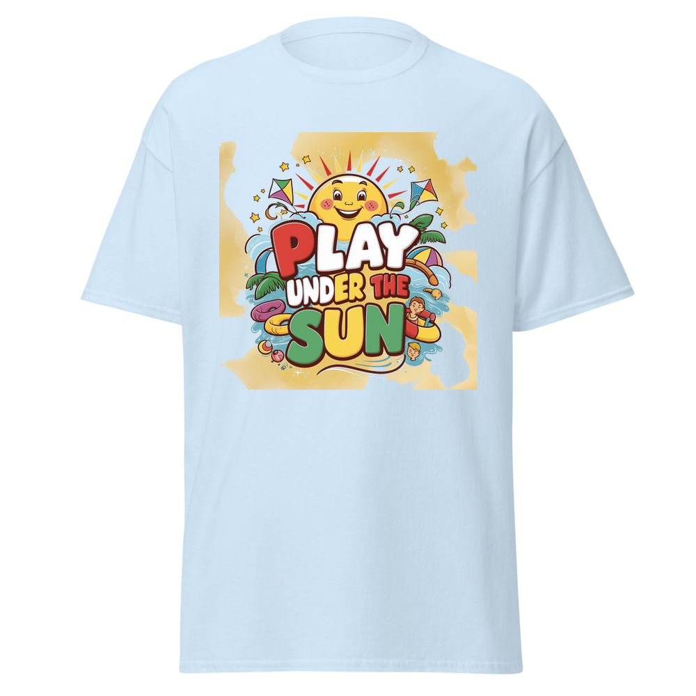 A cheerful cartoon sun with a bright smile, surrounded by fun, colorful toys like kites and beach balls. Sparkling stars add an extra touch of magic to this adorable design, perfect for sunny day adventures.This t-shirt is everything you’ve dreamed of and more. It feels soft and lightweight, with the right amount of stretch. It’s comfortable and flattering for all. 100% combed and ring-spun cotton (Heather colors contain polyester) Fabric weight: 4.2 oz./yd.² (142 g/m²) Pre-shrunk fabric Side-seamed construction Shoulder-to-shoulder taping