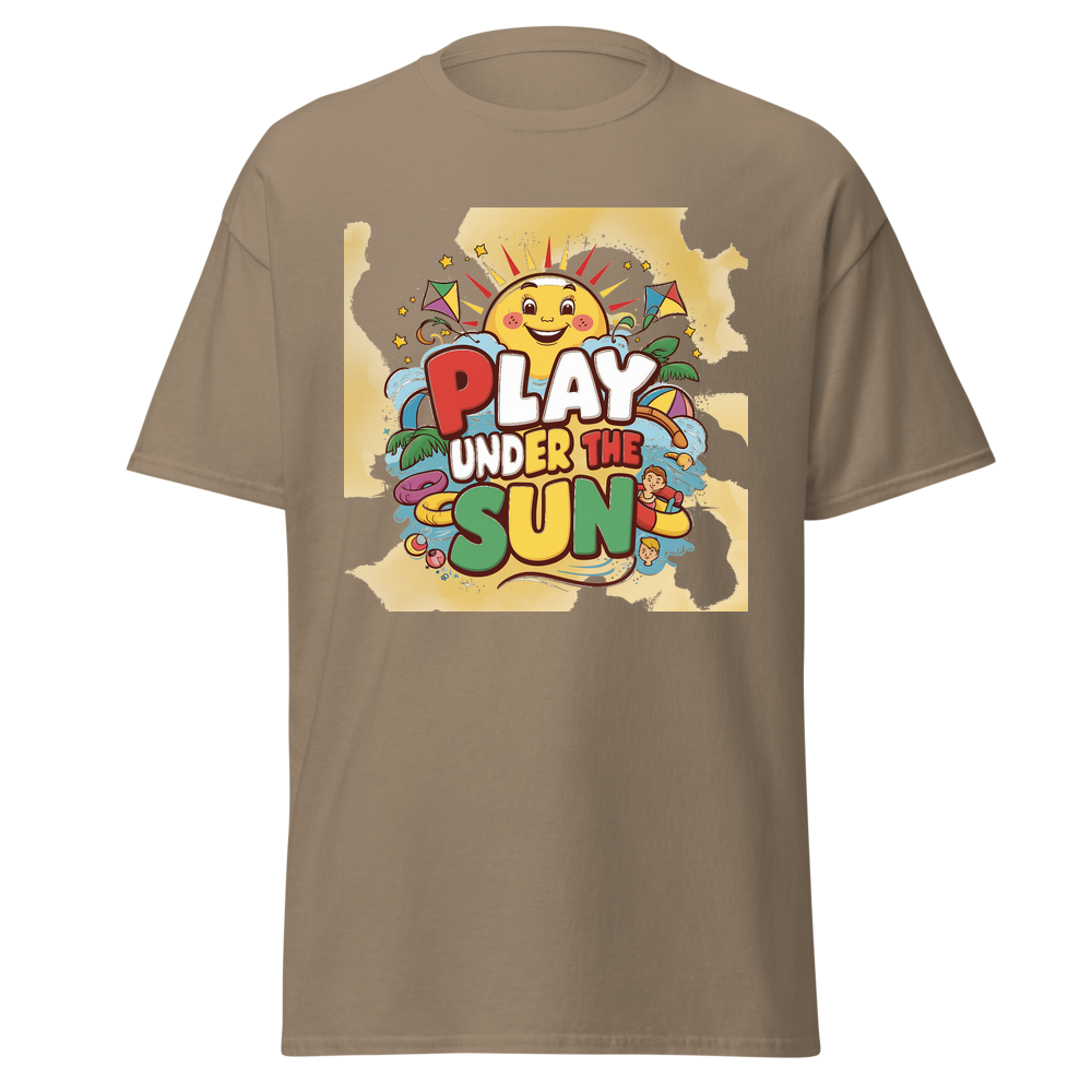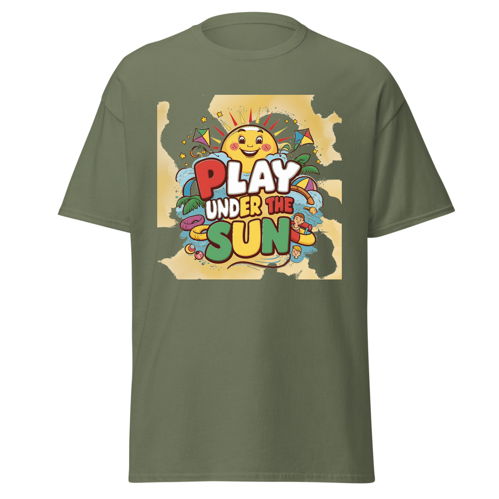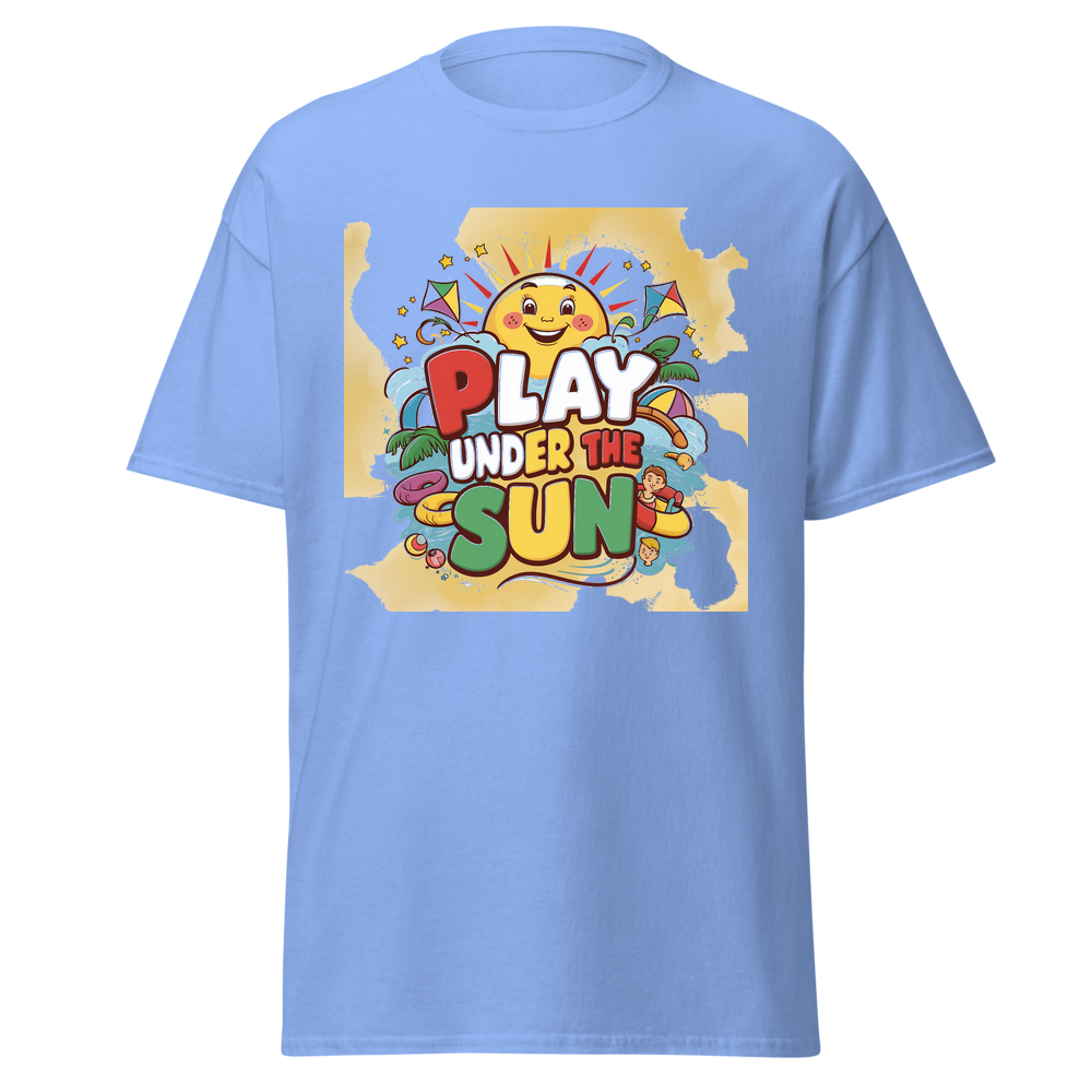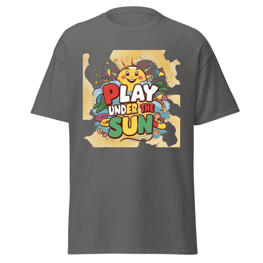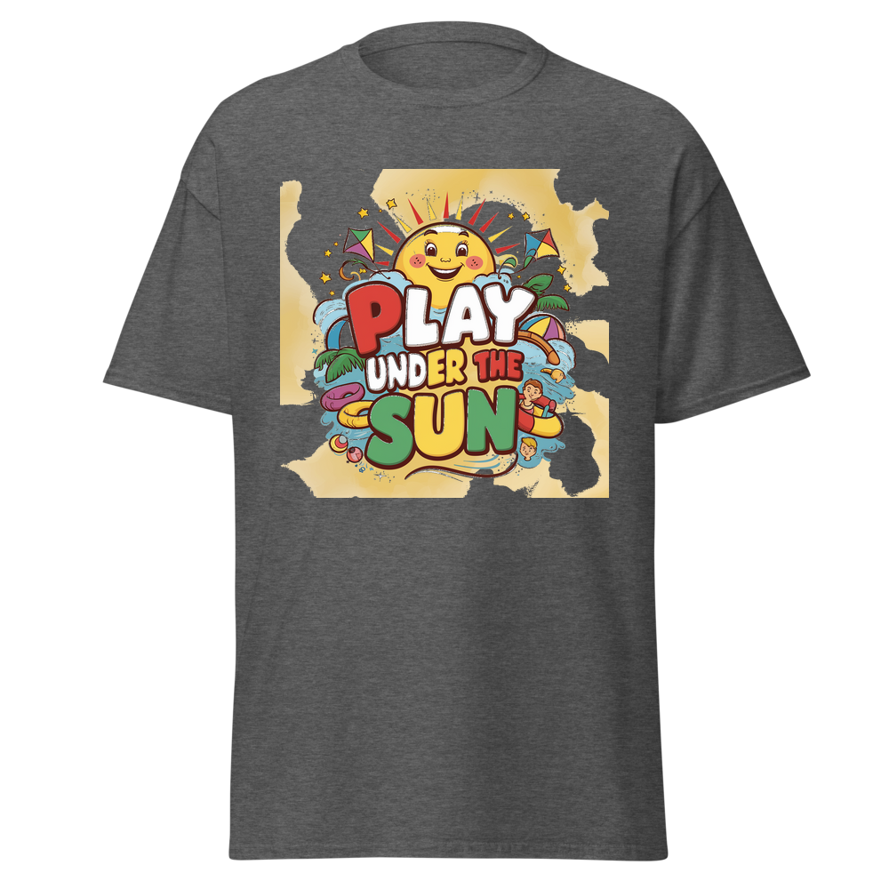 A cheerful cartoon sun with a bright smile, surrounded by fun, colorful toys like kites and beach balls. Sparkling stars add an extra touch of magic to this adorable design, perfect for sunny day adventures.This t-shirt is everything you’ve dreamed of and more. It feels soft and lightweight, with the right amount of stretch. It’s comfortable and flattering for all. 100% combed and ring-spun cotton (Heather colors contain polyester) Fabric weight: 4.2 oz./yd.² (142 g/m²) Pre-shrunk fabric Side-seamed construction Shoulder-to-shoulder taping