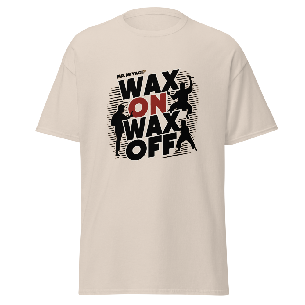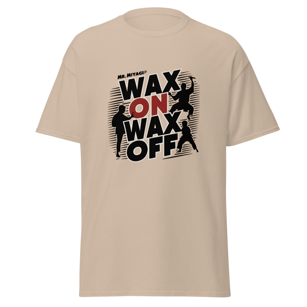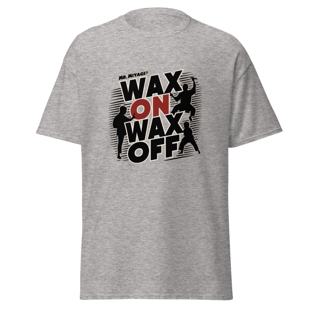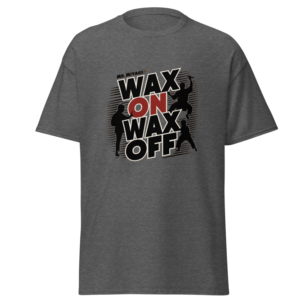 A striking silhouette of Mr. Miyagi teaching the classic waxing motion, with the Karate Kid practicing in the background. A must-have for fans of classic movies, perfect for young adults and women who love nostalgic throwbacks.This t-shirt is everything you’ve dreamed of and more. It feels soft and lightweight, with the right amount of stretch. It’s comfortable and flattering for all. 100% combed and ring-spun cotton (Heather colors contain polyester) Fabric weight: 4.2 oz./yd.² (142 g/m²) Pre-shrunk fabric Side-seamed construction Shoulder-to-shoulder taping