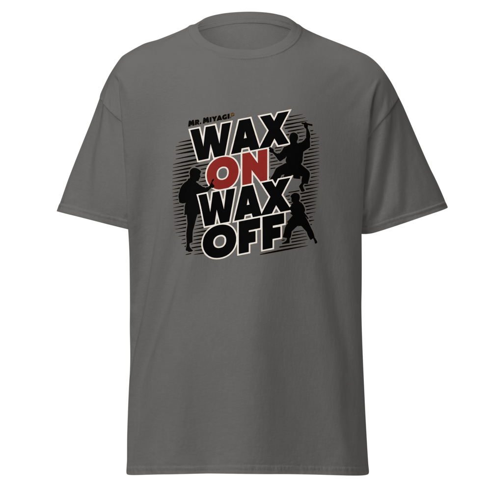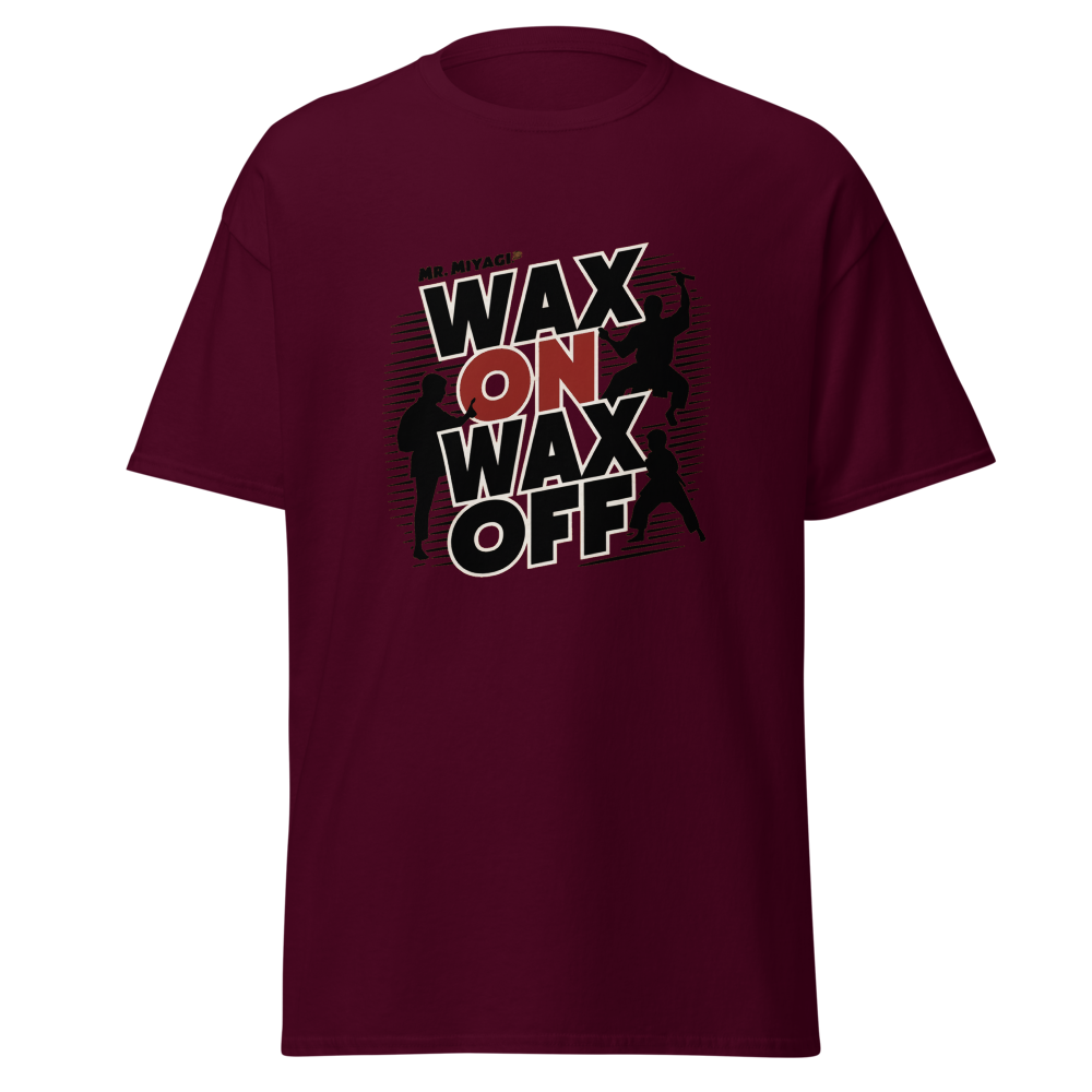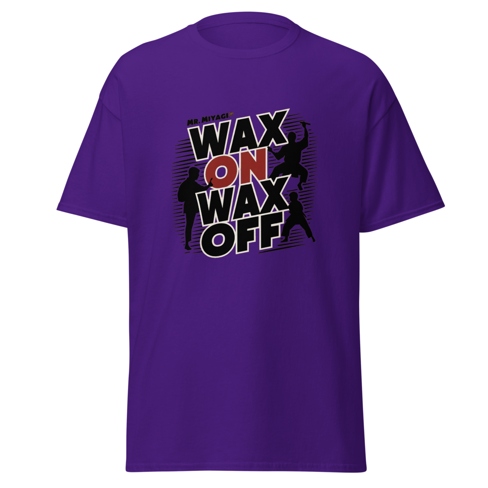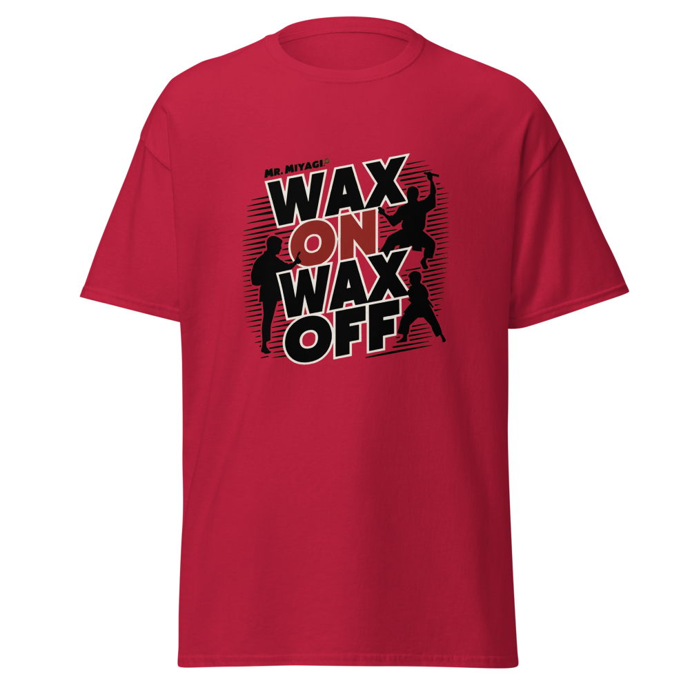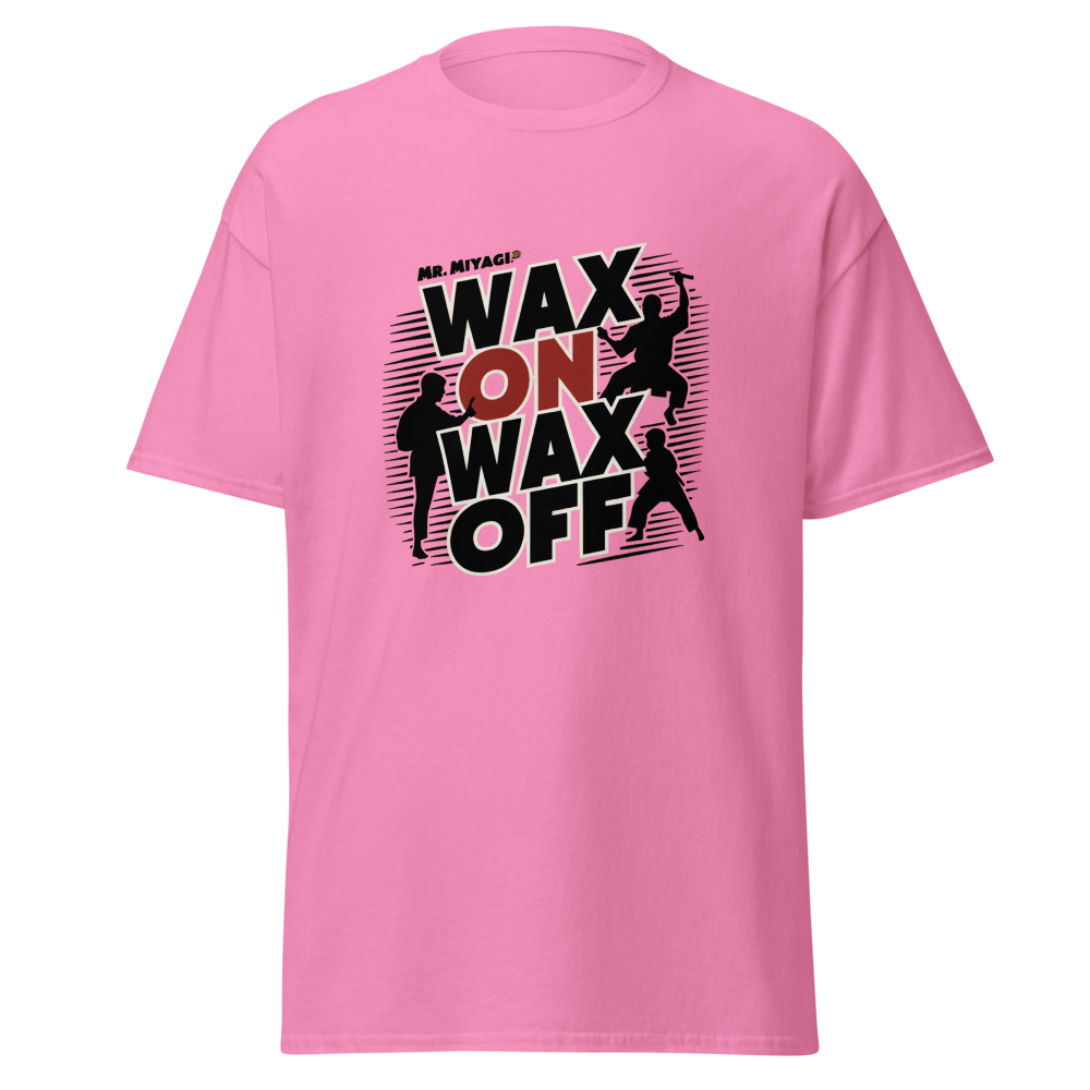 A striking silhouette of Mr. Miyagi teaching the classic waxing motion, with the Karate Kid practicing in the background. A must-have for fans of classic movies, perfect for young adults and women who love nostalgic throwbacks.This t-shirt is everything you’ve dreamed of and more. It feels soft and lightweight, with the right amount of stretch. It’s comfortable and flattering for all. 100% combed and ring-spun cotton (Heather colors contain polyester) Fabric weight: 4.2 oz./yd.² (142 g/m²) Pre-shrunk fabric Side-seamed construction Shoulder-to-shoulder taping