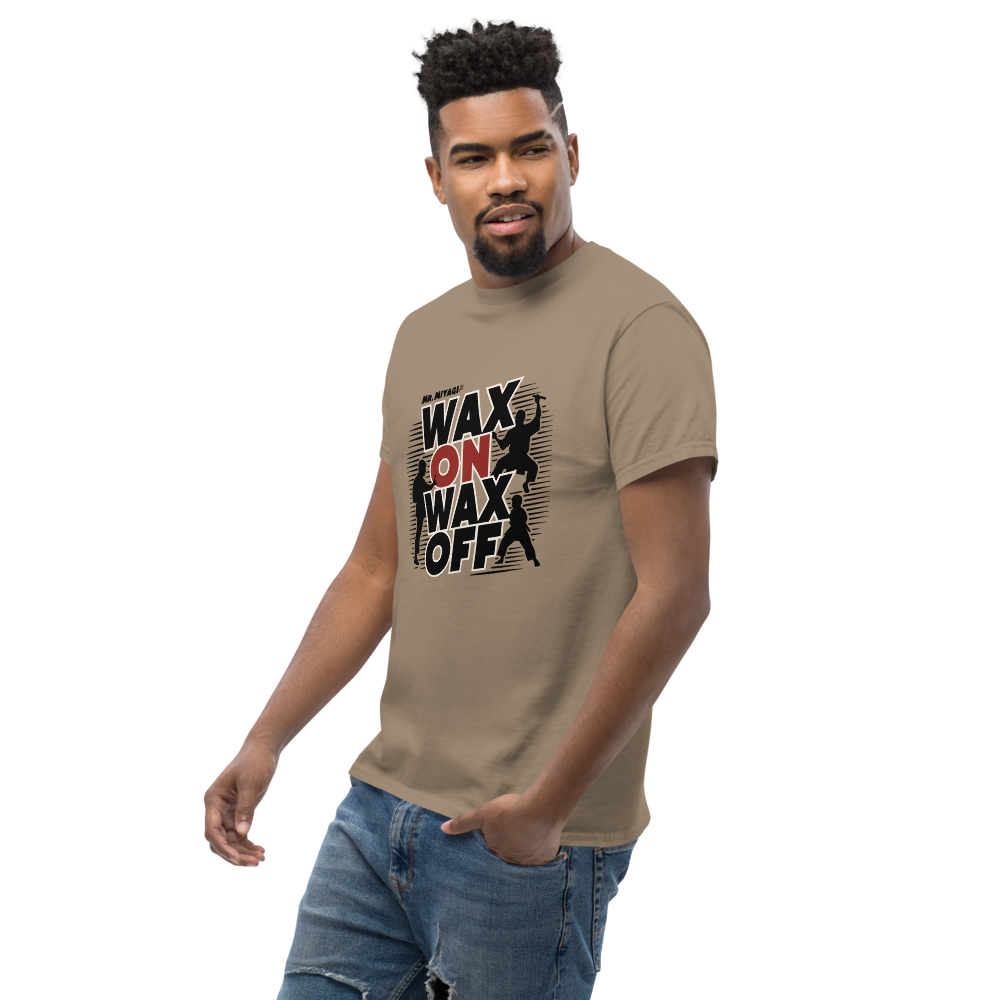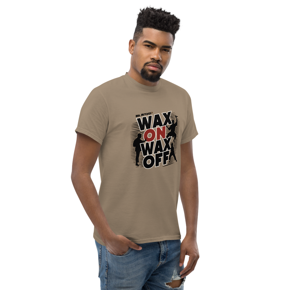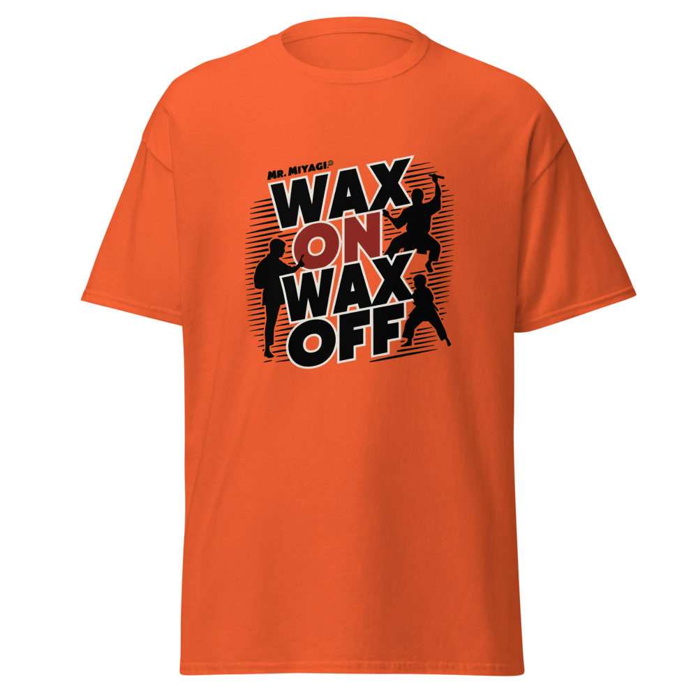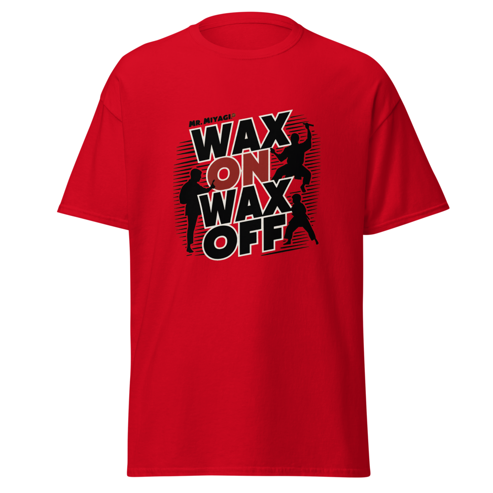 A striking silhouette of Mr. Miyagi teaching the classic waxing motion, with the Karate Kid practicing in the background. A must-have for fans of classic movies, perfect for young adults and women who love nostalgic throwbacks.This t-shirt is everything you’ve dreamed of and more. It feels soft and lightweight, with the right amount of stretch. It’s comfortable and flattering for all. 100% combed and ring-spun cotton (Heather colors contain polyester) Fabric weight: 4.2 oz./yd.² (142 g/m²) Pre-shrunk fabric Side-seamed construction Shoulder-to-shoulder taping