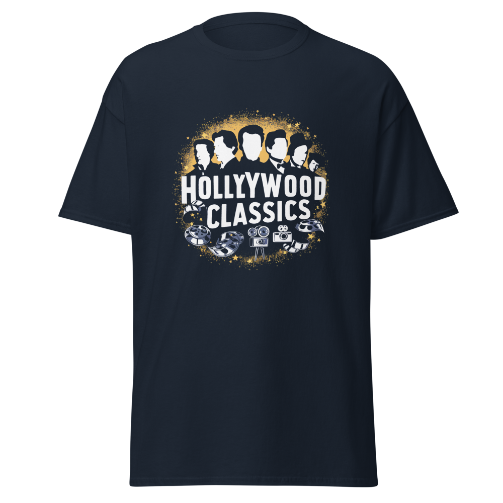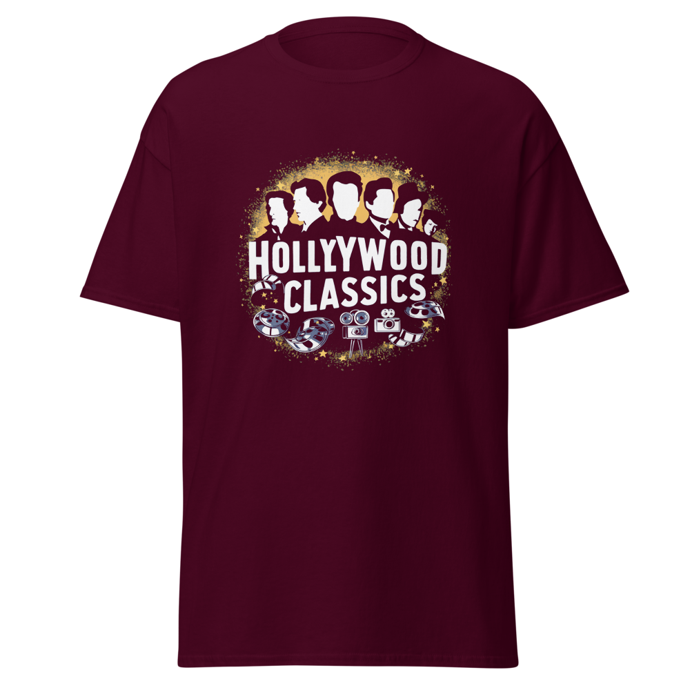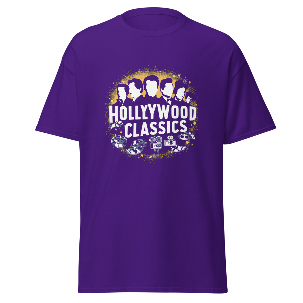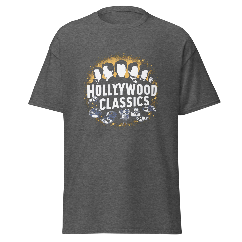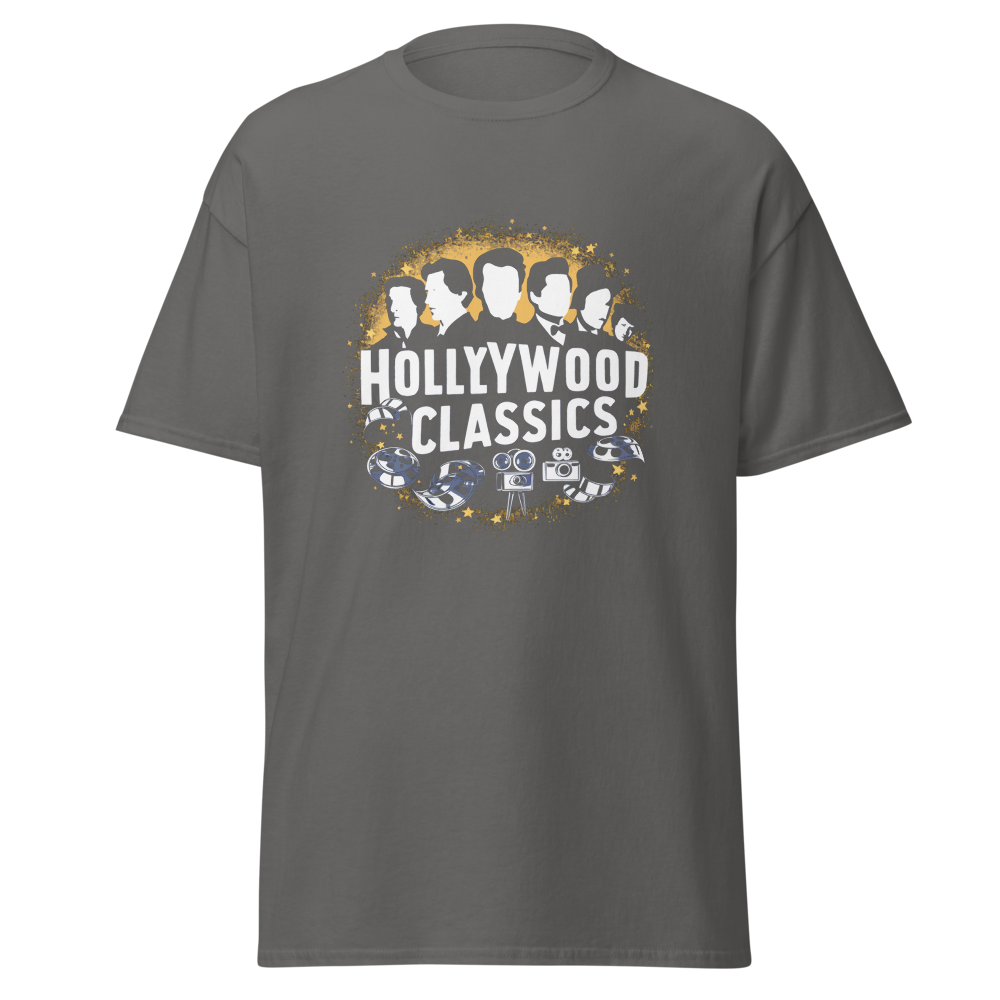 Celebrate the golden age of cinema with this stylish tee featuring the silhouettes of iconic actors, vintage movie reels, and classic cameras, all surrounded by a sprinkle of stars. Perfect for classic movie buffs and anyone who loves a touch of old Hollywood glamour.This t-shirt is everything you’ve dreamed of and more. It feels soft and lightweight, with the right amount of stretch. It’s comfortable and flattering for all. 100% combed and ring-spun cotton (Heather colors contain polyester) Fabric weight: 4.2 oz./yd.² (142 g/m²) Pre-shrunk fabric Side-seamed construction Shoulder-to-shoulder taping
