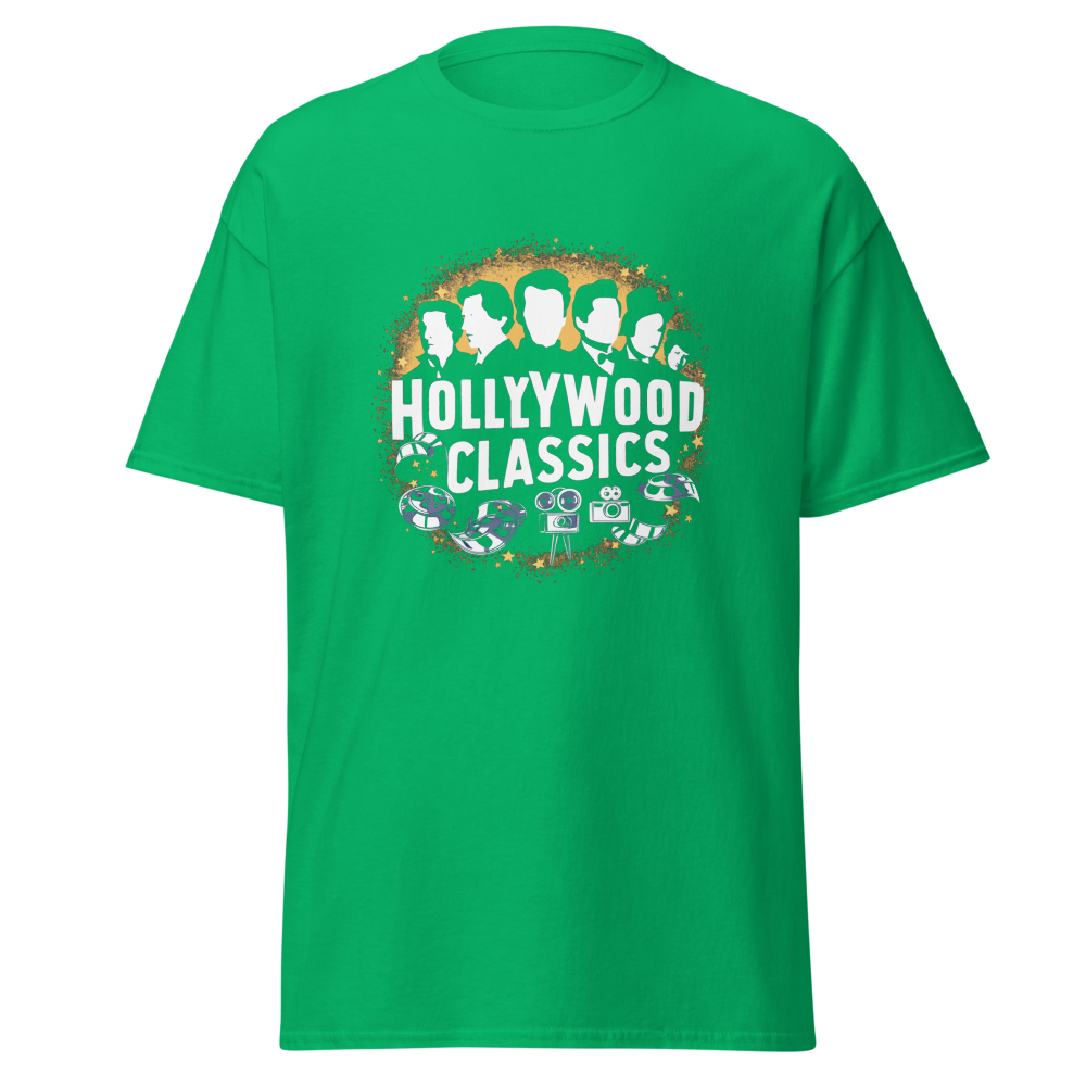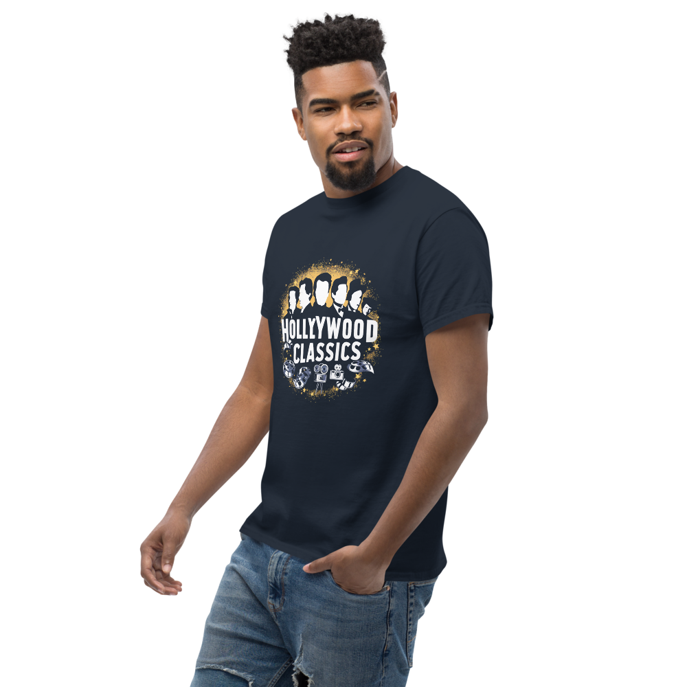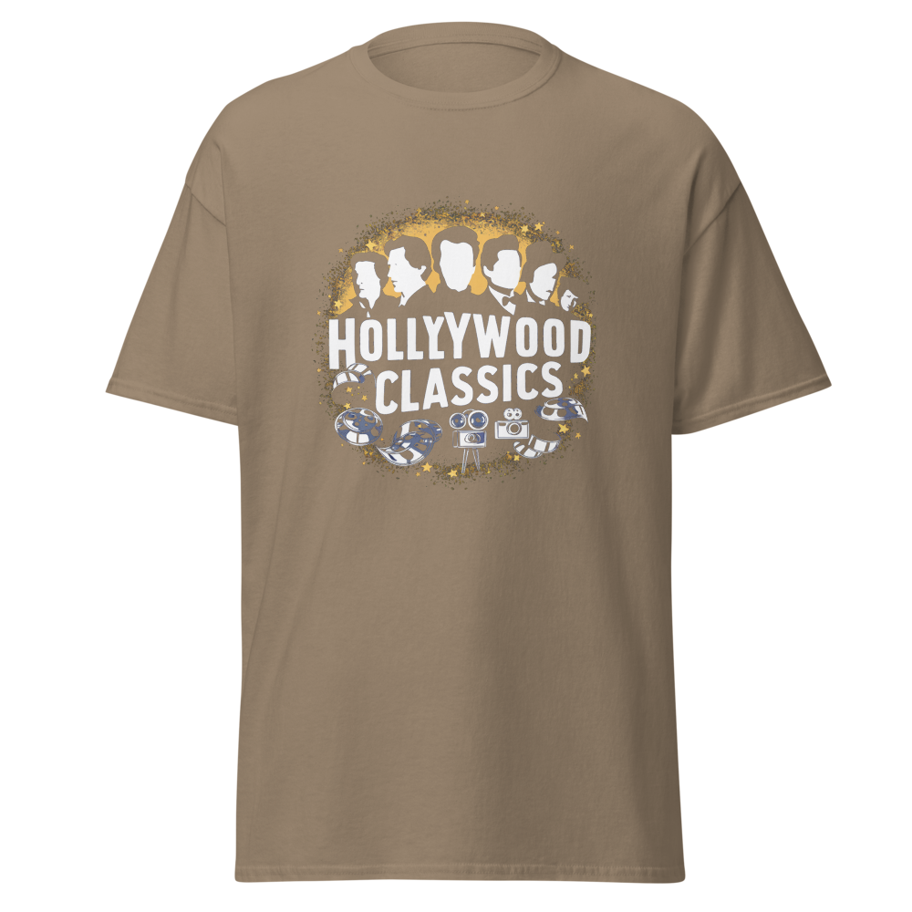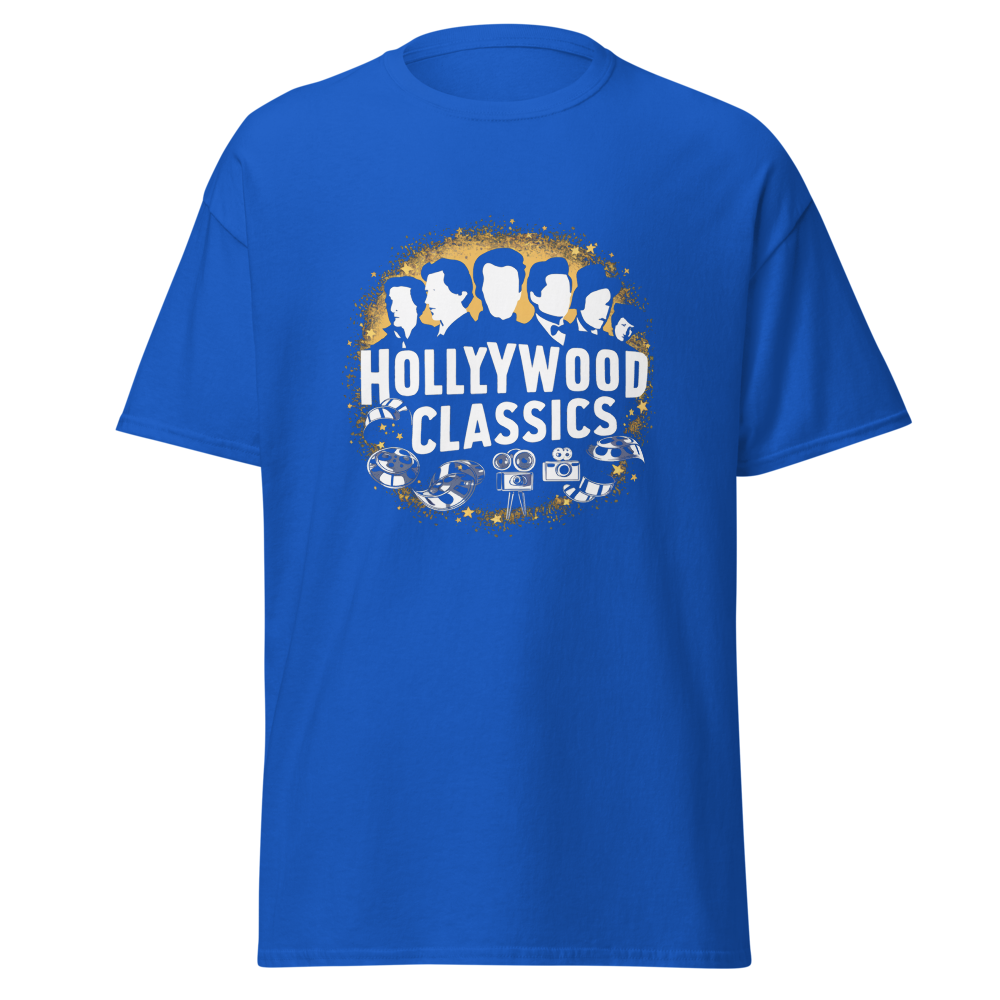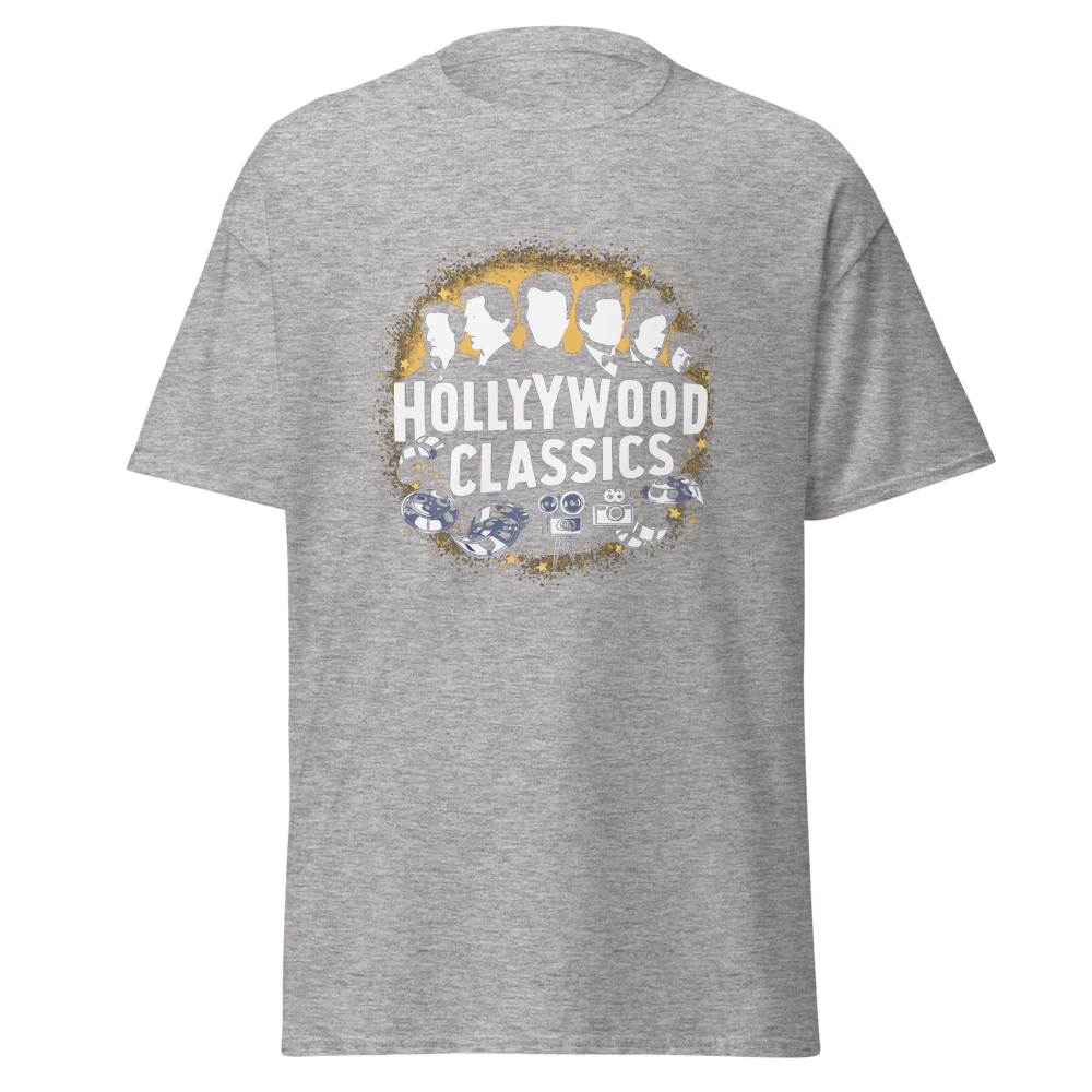 Celebrate the golden age of cinema with this stylish tee featuring the silhouettes of iconic actors, vintage movie reels, and classic cameras, all surrounded by a sprinkle of stars. Perfect for classic movie buffs and anyone who loves a touch of old Hollywood glamour.This t-shirt is everything you’ve dreamed of and more. It feels soft and lightweight, with the right amount of stretch. It’s comfortable and flattering for all. 100% combed and ring-spun cotton (Heather colors contain polyester) Fabric weight: 4.2 oz./yd.² (142 g/m²) Pre-shrunk fabric Side-seamed construction Shoulder-to-shoulder taping