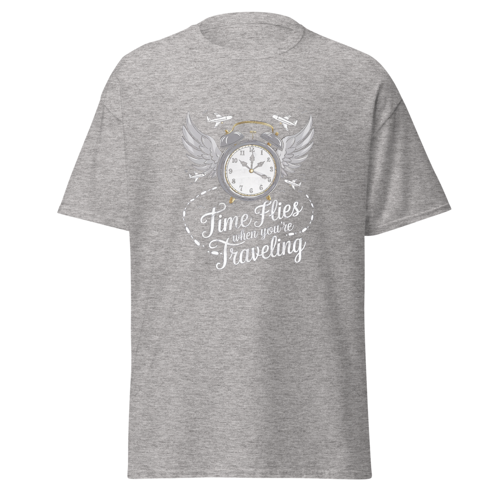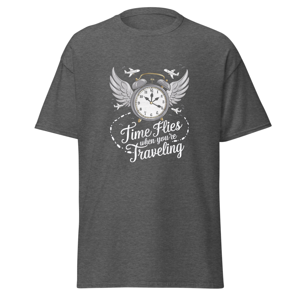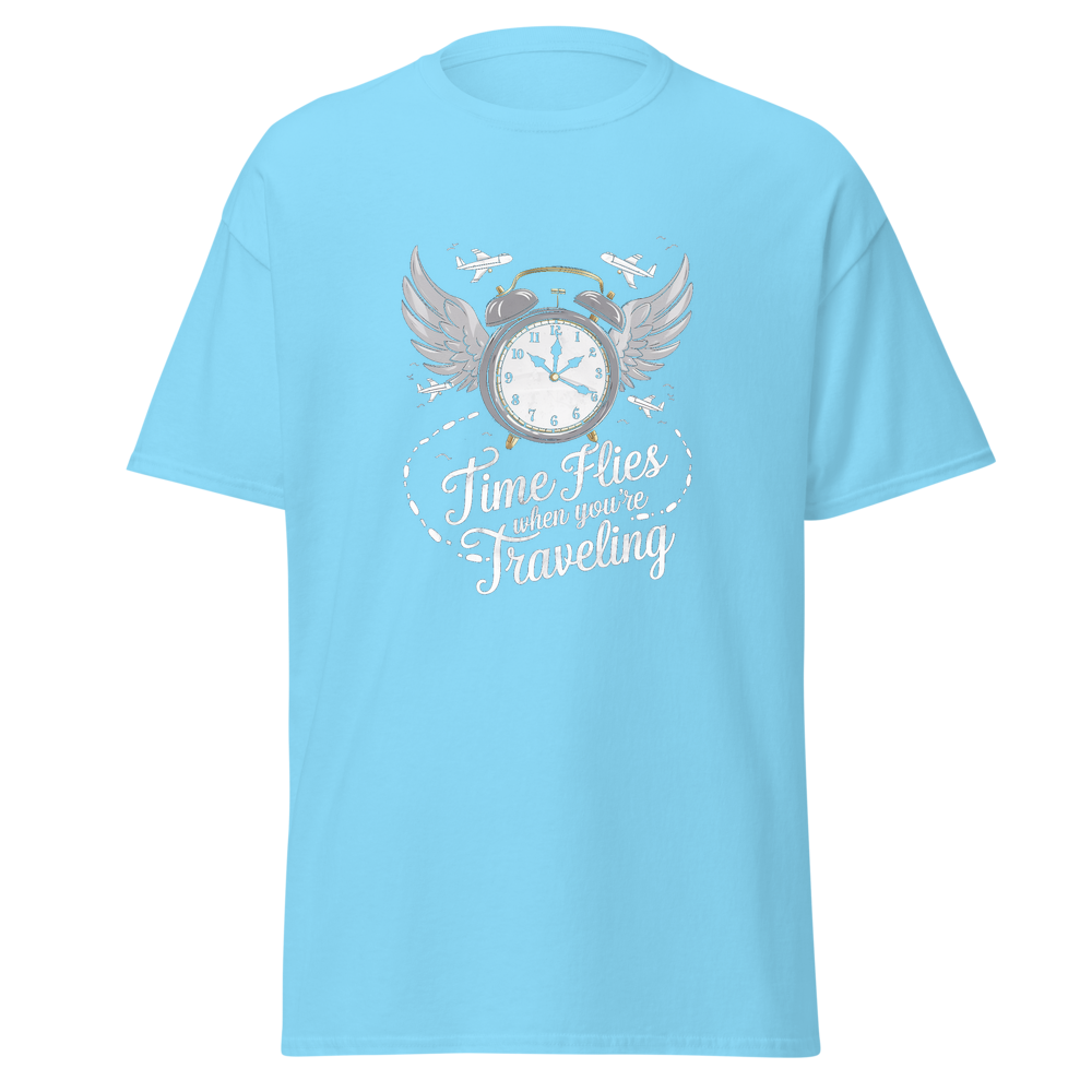 This t-shirt features an old-fashioned clock with wings, surrounded by small airplanes and footprints leading off into the distance. Perfect for those who love to travel and embrace the saying, “Time Flies When You’re Traveling.”This t-shirt is everything you’ve dreamed of and more. It feels soft and lightweight, with the right amount of stretch. It’s comfortable and flattering for all. 100% combed and ring-spun cotton (Heather colors contain polyester) Fabric weight: 4.2 oz./yd.² (142 g/m²) Pre-shrunk fabric Side-seamed construction Shoulder-to-shoulder taping