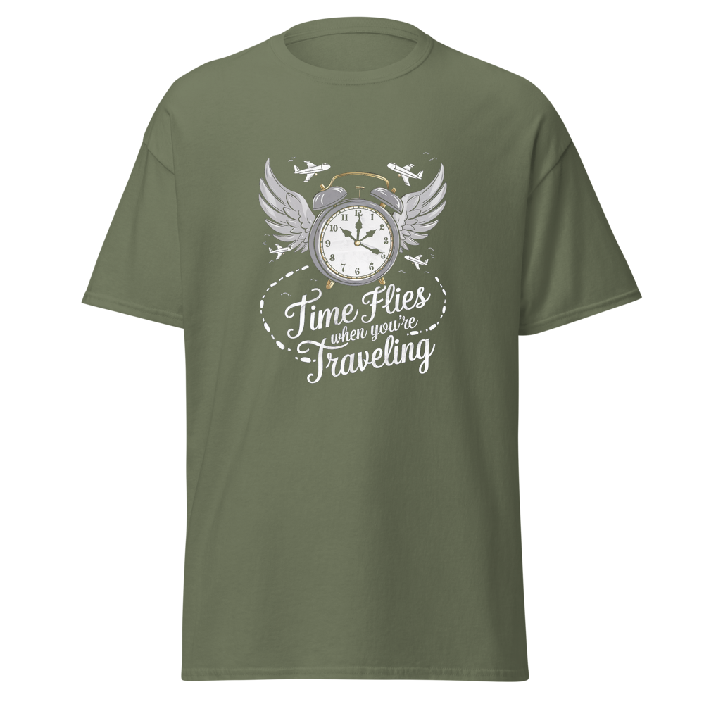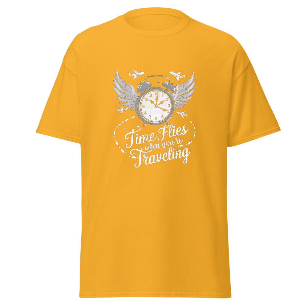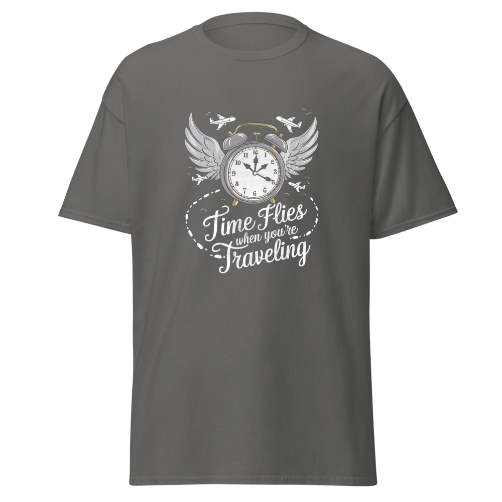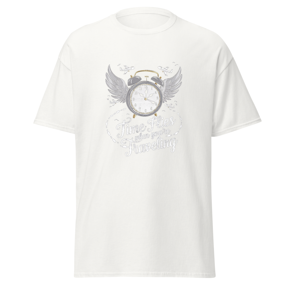 This t-shirt features an old-fashioned clock with wings, surrounded by small airplanes and footprints leading off into the distance. Perfect for those who love to travel and embrace the saying, “Time Flies When You’re Traveling.”This t-shirt is everything you’ve dreamed of and more. It feels soft and lightweight, with the right amount of stretch. It’s comfortable and flattering for all. 100% combed and ring-spun cotton (Heather colors contain polyester) Fabric weight: 4.2 oz./yd.² (142 g/m²) Pre-shrunk fabric Side-seamed construction Shoulder-to-shoulder taping