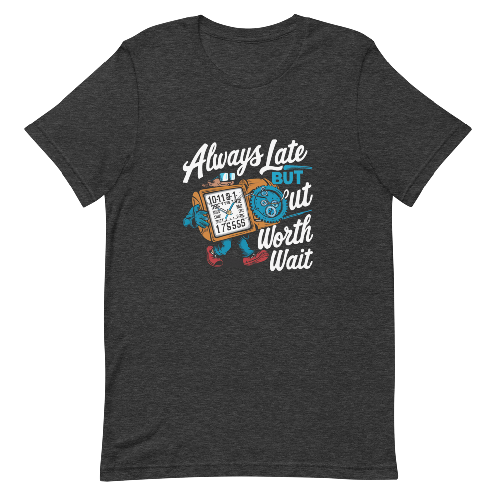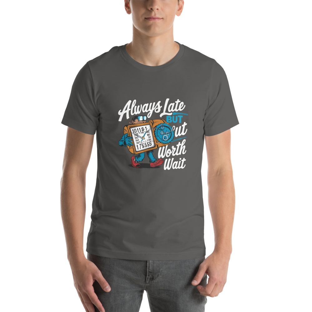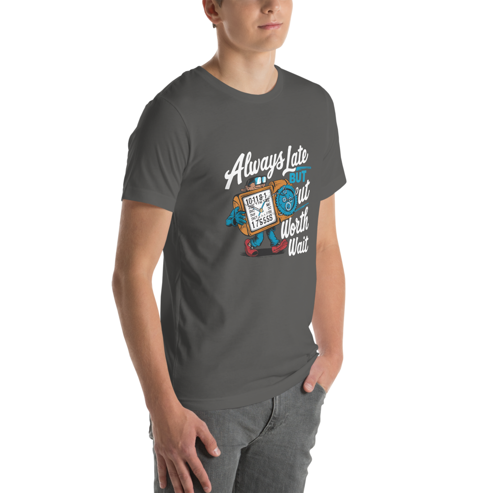 Embrace the adventures of a quirky time traveler sporting a funny gadget watch with different times and dates. Perfect for teens and comic book fans with a sense of humor, this shirt is a charming twist on staying fashionably late.This t-shirt is everything you’ve dreamed of and more. It feels soft and lightweight, with the right amount of stretch. It’s comfortable and flattering for all. 100% combed and ring-spun cotton (Heather colors contain polyester) Fabric weight: 4.2 oz./yd.² (142 g/m²) Pre-shrunk fabric Side-seamed construction Shoulder-to-shoulder taping