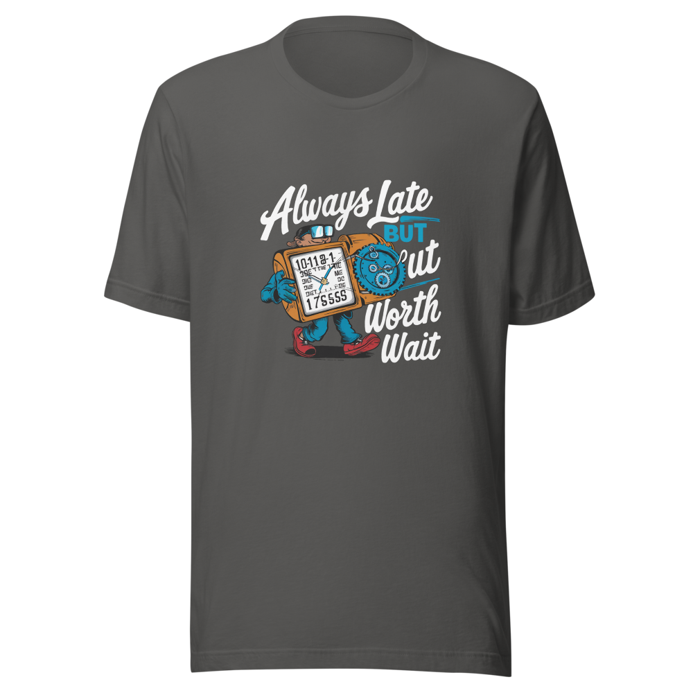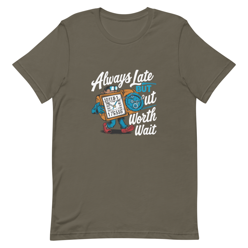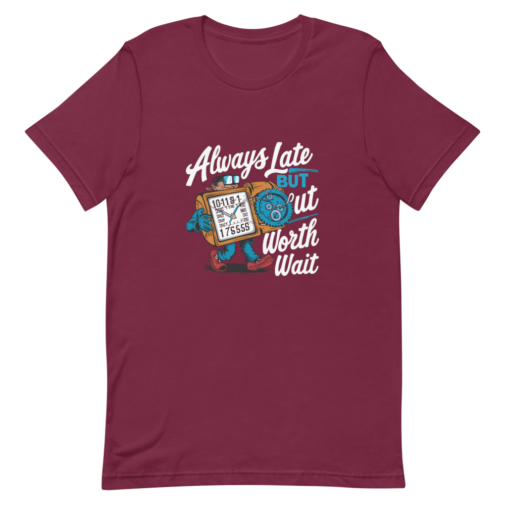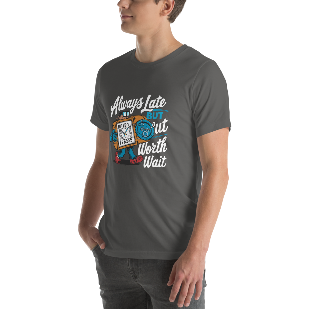 Embrace the adventures of a quirky time traveler sporting a funny gadget watch with different times and dates. Perfect for teens and comic book fans with a sense of humor, this shirt is a charming twist on staying fashionably late.This t-shirt is everything you’ve dreamed of and more. It feels soft and lightweight, with the right amount of stretch. It’s comfortable and flattering for all. 100% combed and ring-spun cotton (Heather colors contain polyester) Fabric weight: 4.2 oz./yd.² (142 g/m²) Pre-shrunk fabric Side-seamed construction Shoulder-to-shoulder taping
