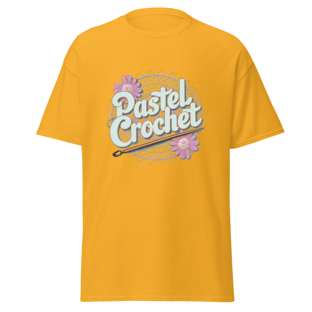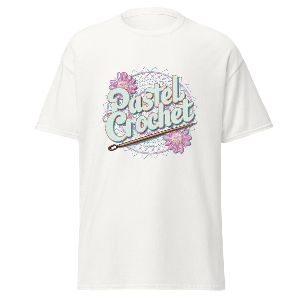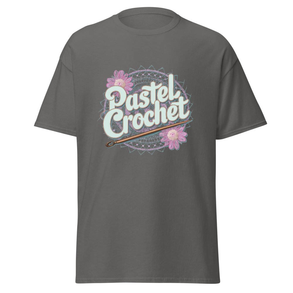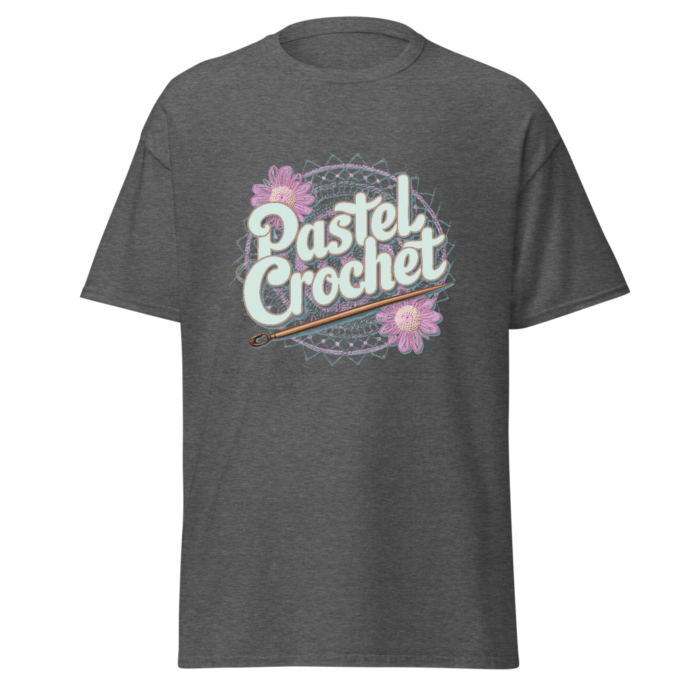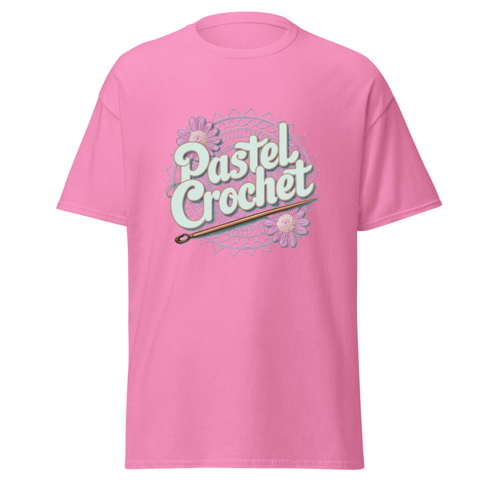 Celebrate the charm of timeless crochet with a neon pastel twist. This design features delicate crochet patterns, a vintage crochet needle, and lovely floral decorations, perfect for traditional craft lovers.This t-shirt is everything you’ve dreamed of and more. It feels soft and lightweight, with the right amount of stretch. It’s comfortable and flattering for all. 100% combed and ring-spun cotton (Heather colors contain polyester) Fabric weight: 4.2 oz./yd.² (142 g/m²) Pre-shrunk fabric Side-seamed construction Shoulder-to-shoulder taping