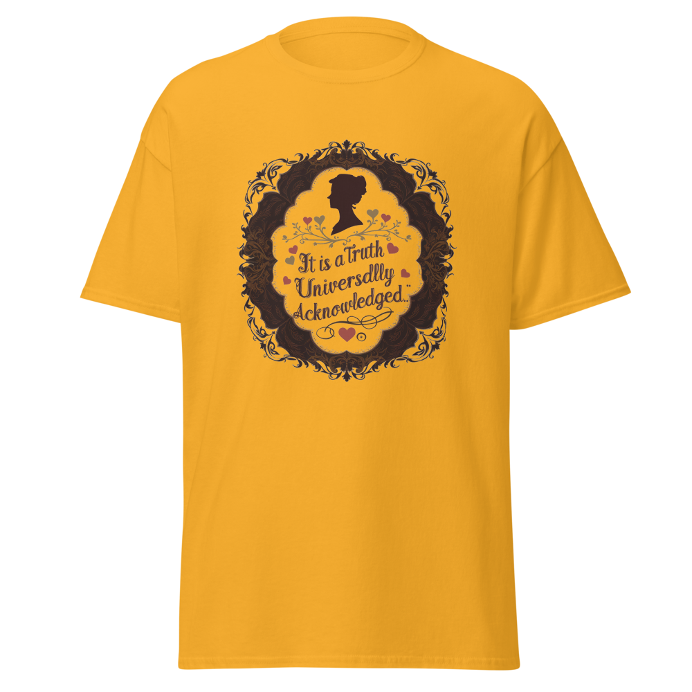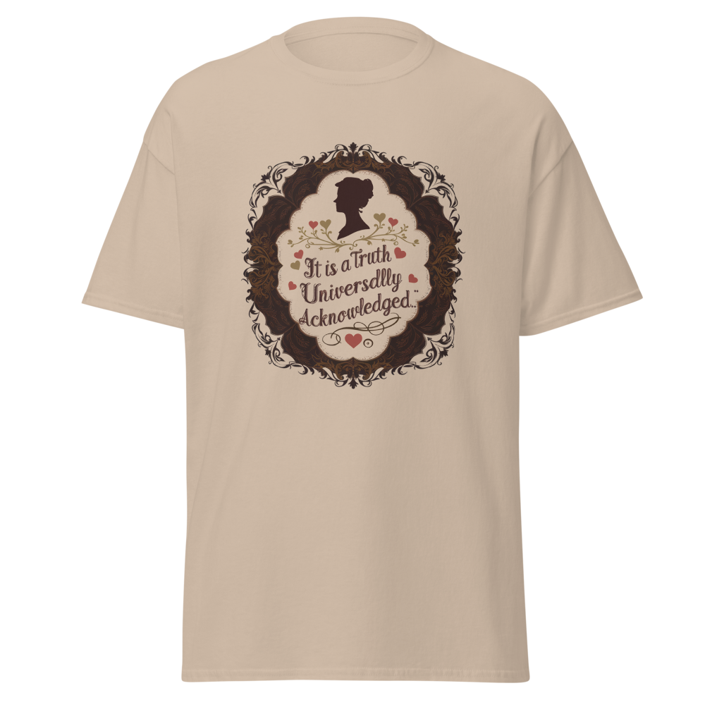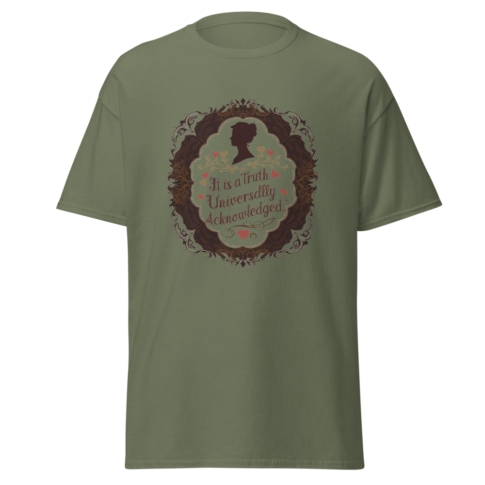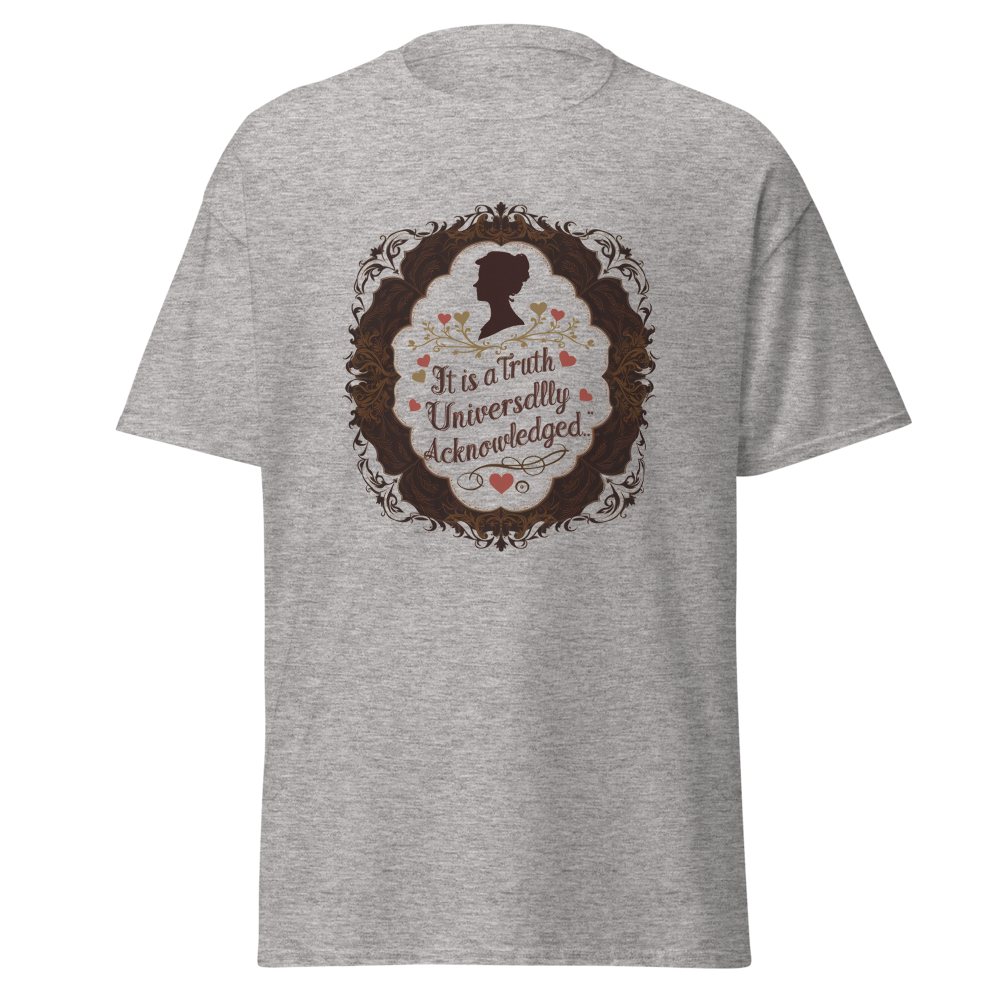 Celebrate your love for classic literature with this elegant design featuring a silhouette of Jane Austen set within a vintage, ornate frame. An old quill and inkwell add a timeless touch, while delicate love hearts intertwined with vines complete the look. Perfect for book lovers and fans of timeless romance.This t-shirt is everything you’ve dreamed of and more. It feels soft and lightweight, with the right amount of stretch. It’s comfortable and flattering for all. 100% combed and ring-spun cotton (Heather colors contain polyester) Fabric weight: 4.2 oz./yd.² (142 g/m²) Pre-shrunk fabric Side-seamed construction Shoulder-to-shoulder taping