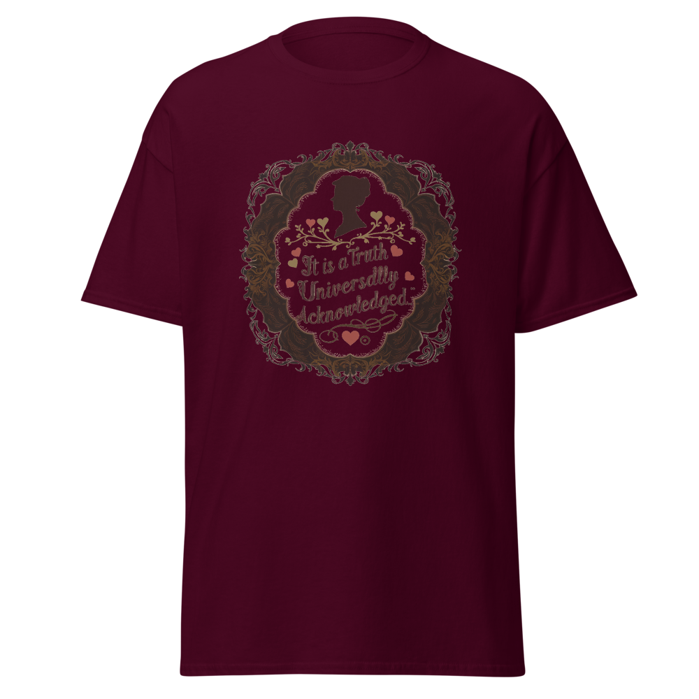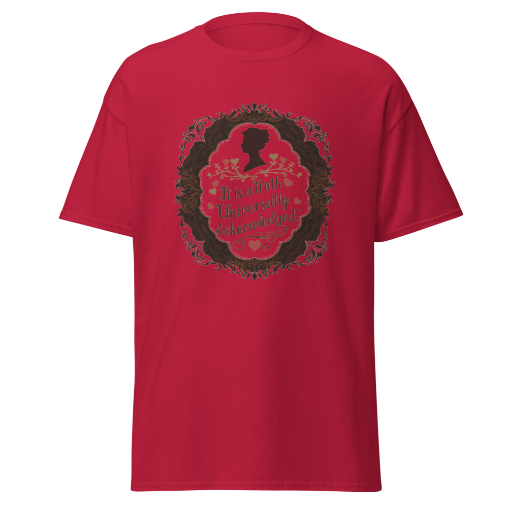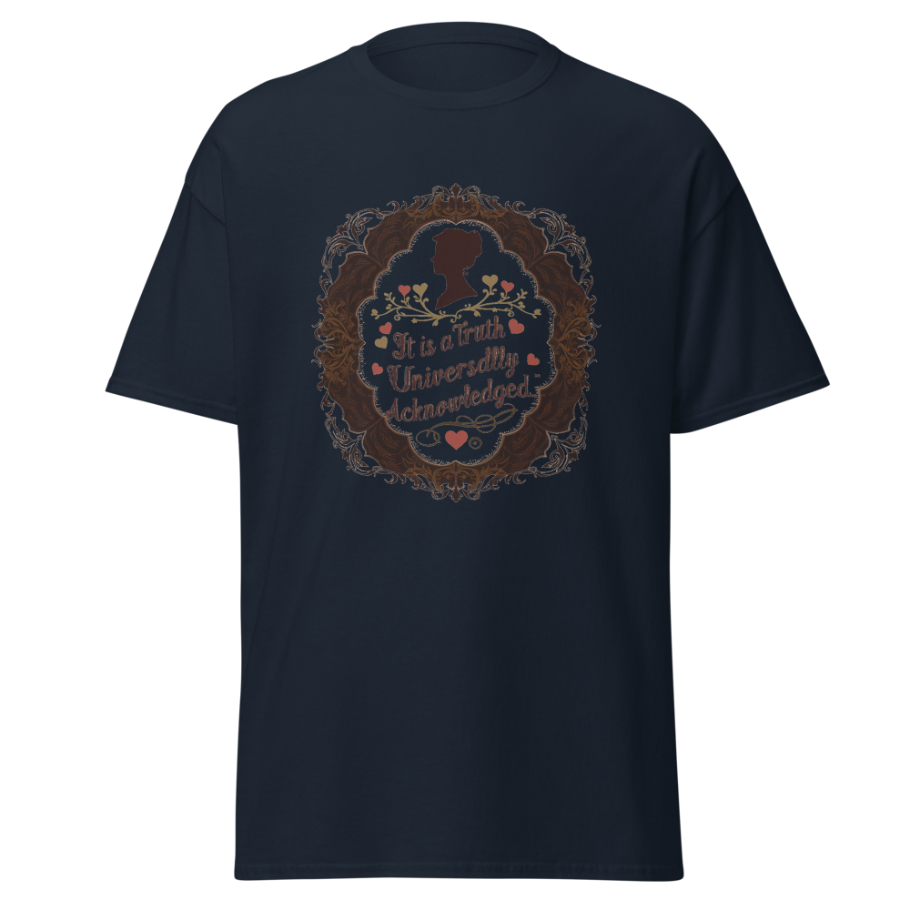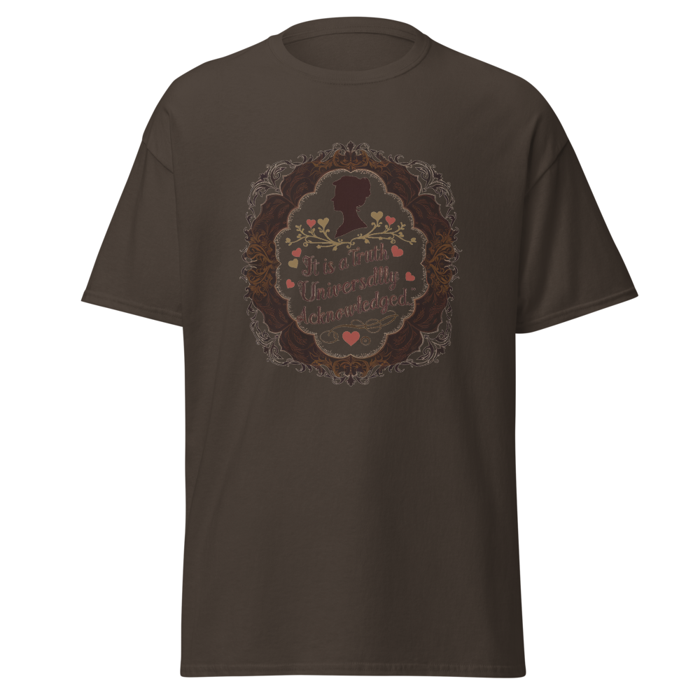 Celebrate your love for classic literature with this elegant design featuring a silhouette of Jane Austen set within a vintage, ornate frame. An old quill and inkwell add a timeless touch, while delicate love hearts intertwined with vines complete the look. Perfect for book lovers and fans of timeless romance.This t-shirt is everything you’ve dreamed of and more. It feels soft and lightweight, with the right amount of stretch. It’s comfortable and flattering for all. 100% combed and ring-spun cotton (Heather colors contain polyester) Fabric weight: 4.2 oz./yd.² (142 g/m²) Pre-shrunk fabric Side-seamed construction Shoulder-to-shoulder taping