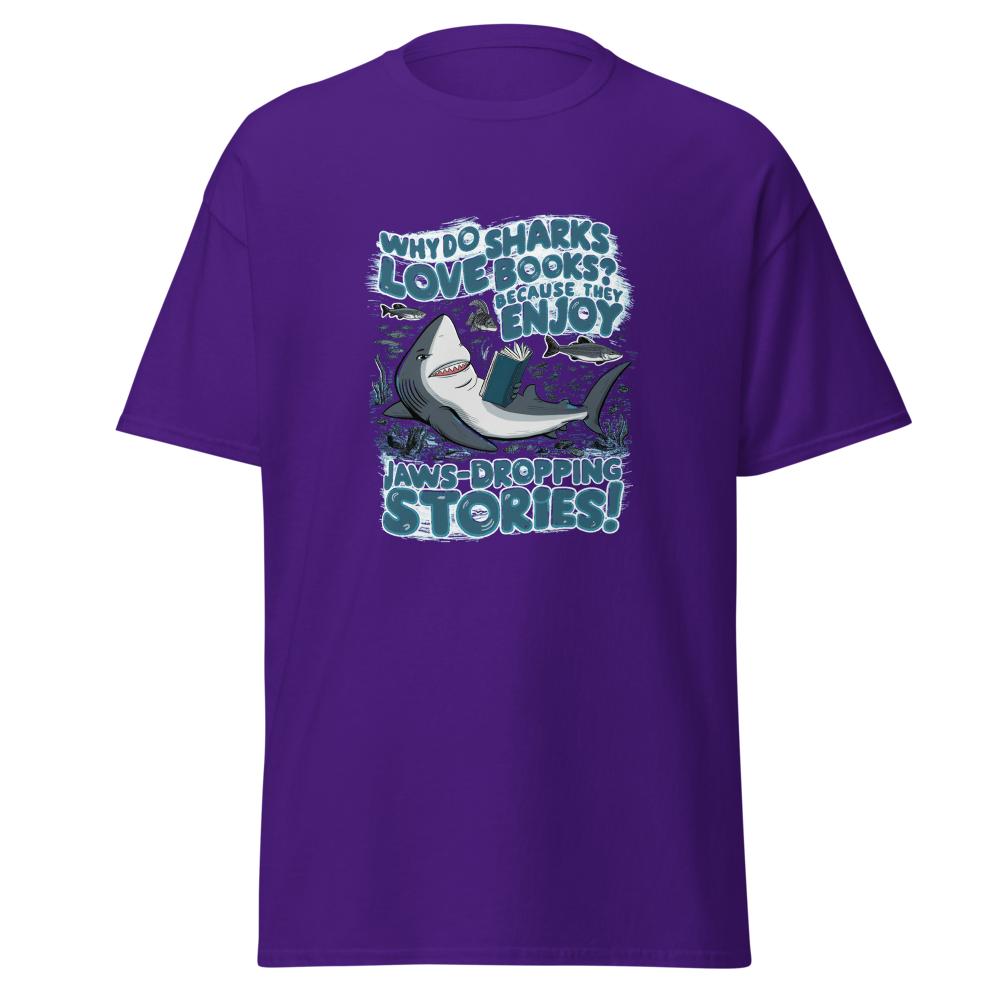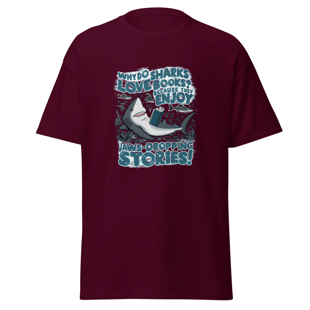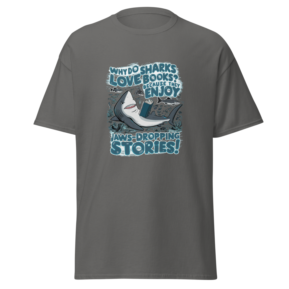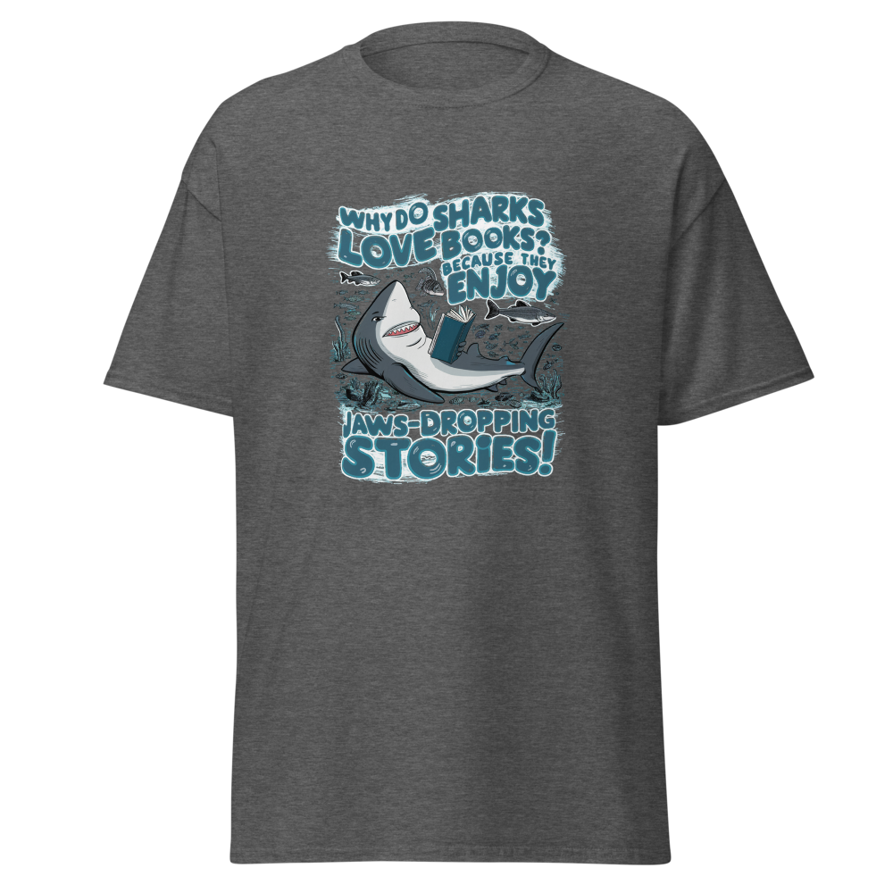 Dive into a fun underwater adventure with this playful t-shirt featuring a shark reading a book, surrounded by fish and marine life illustrations. Perfect for kids and bookworms who love a good tale.This t-shirt is everything you’ve dreamed of and more. It feels soft and lightweight, with the right amount of stretch. It’s comfortable and flattering for all. 100% combed and ring-spun cotton (Heather colors contain polyester) Fabric weight: 4.2 oz./yd.² (142 g/m²) Pre-shrunk fabric Side-seamed construction Shoulder-to-shoulder taping
