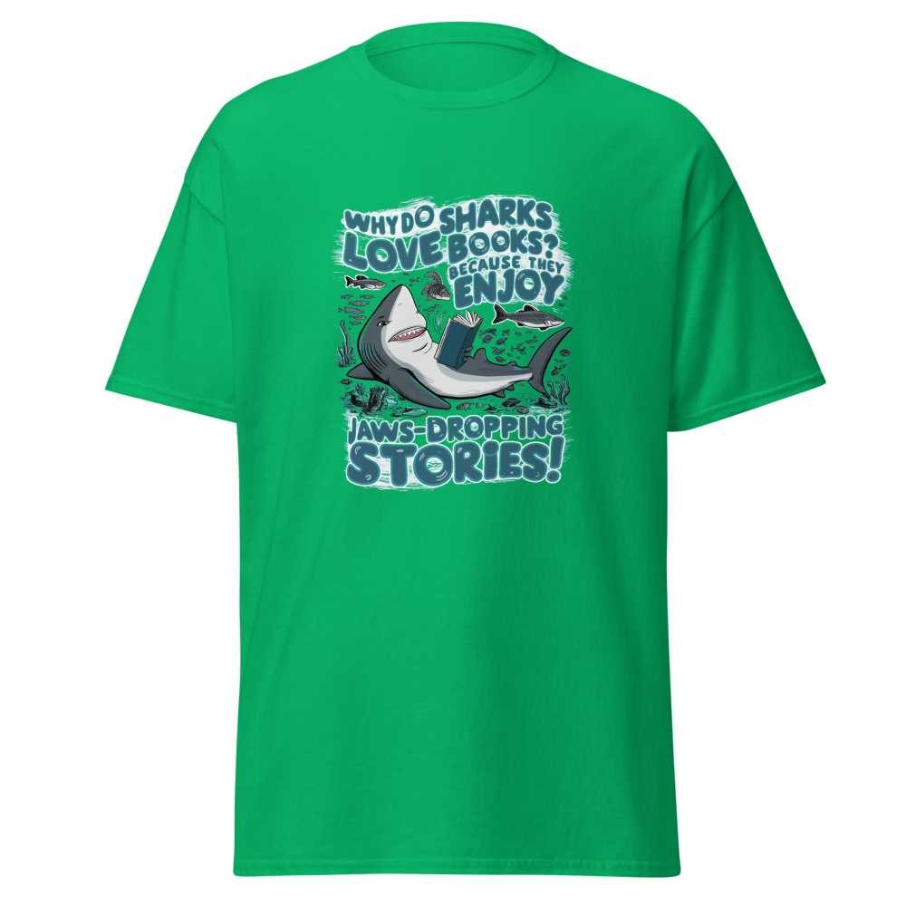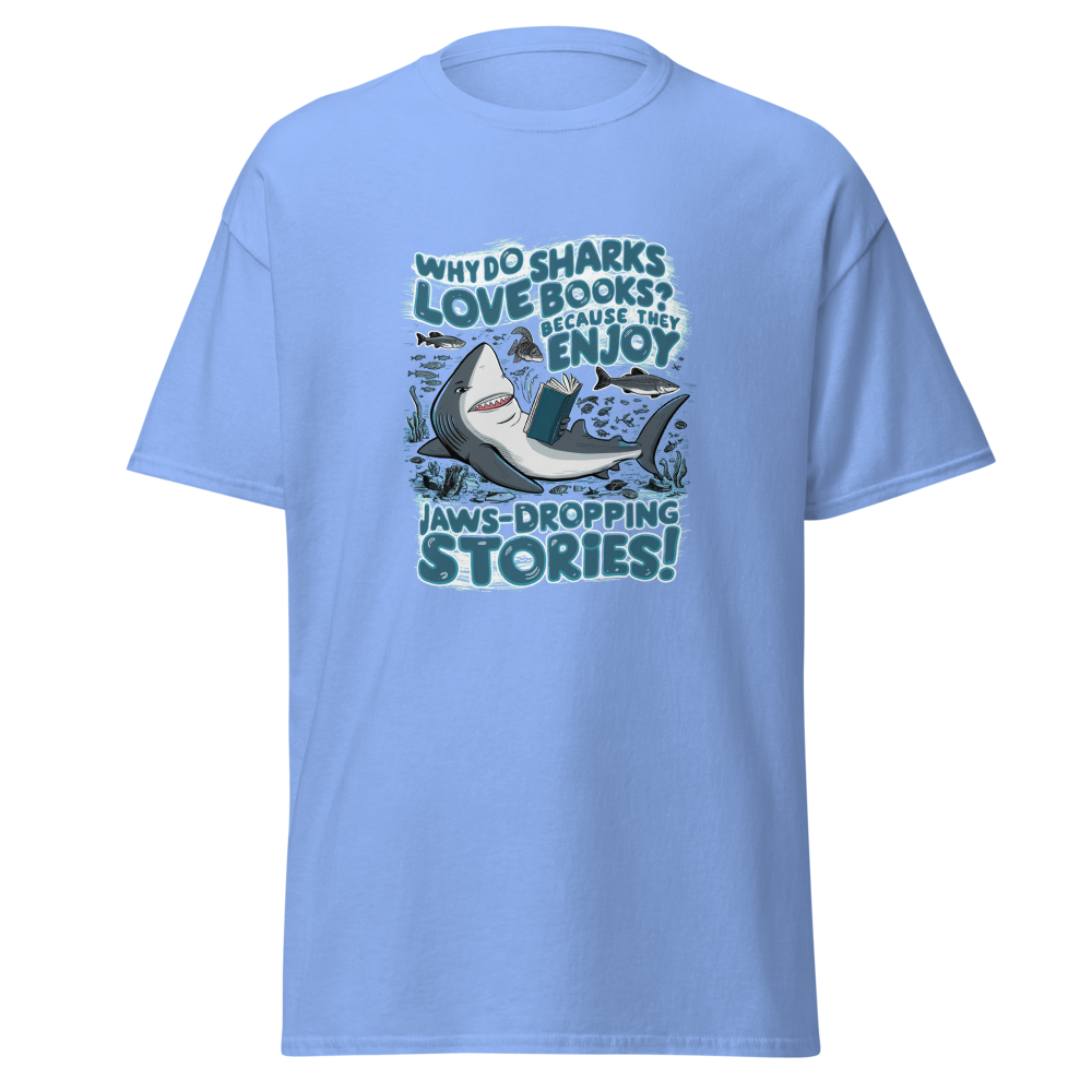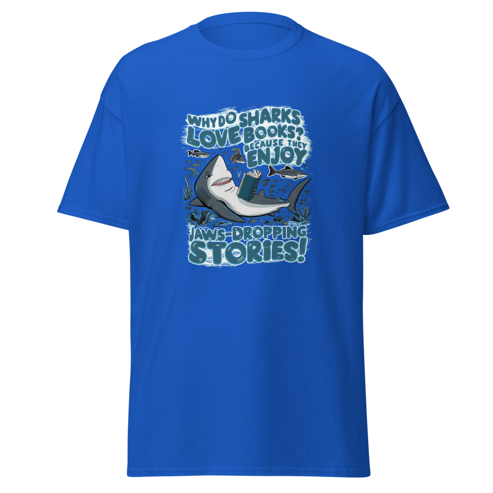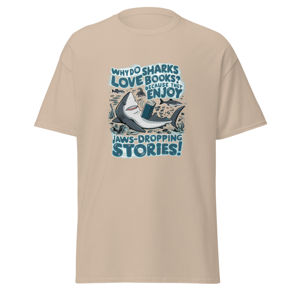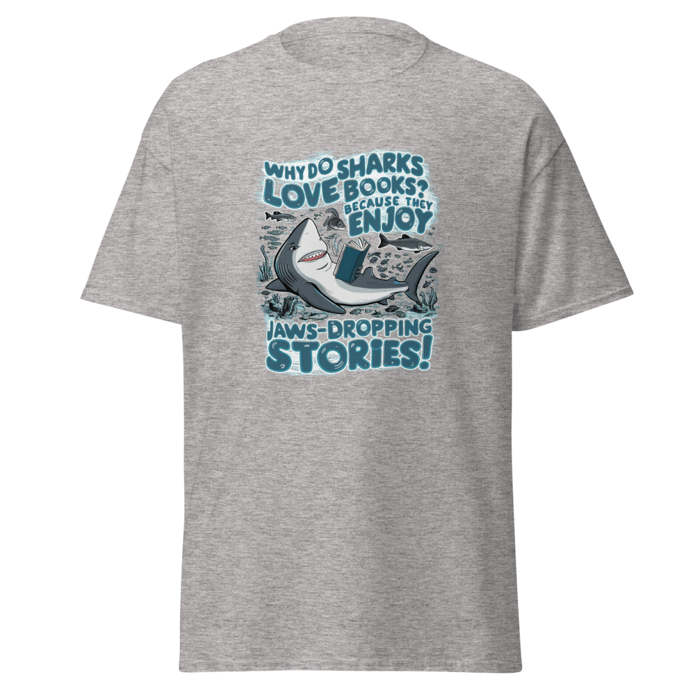 Dive into a fun underwater adventure with this playful t-shirt featuring a shark reading a book, surrounded by fish and marine life illustrations. Perfect for kids and bookworms who love a good tale.This t-shirt is everything you’ve dreamed of and more. It feels soft and lightweight, with the right amount of stretch. It’s comfortable and flattering for all. 100% combed and ring-spun cotton (Heather colors contain polyester) Fabric weight: 4.2 oz./yd.² (142 g/m²) Pre-shrunk fabric Side-seamed construction Shoulder-to-shoulder taping