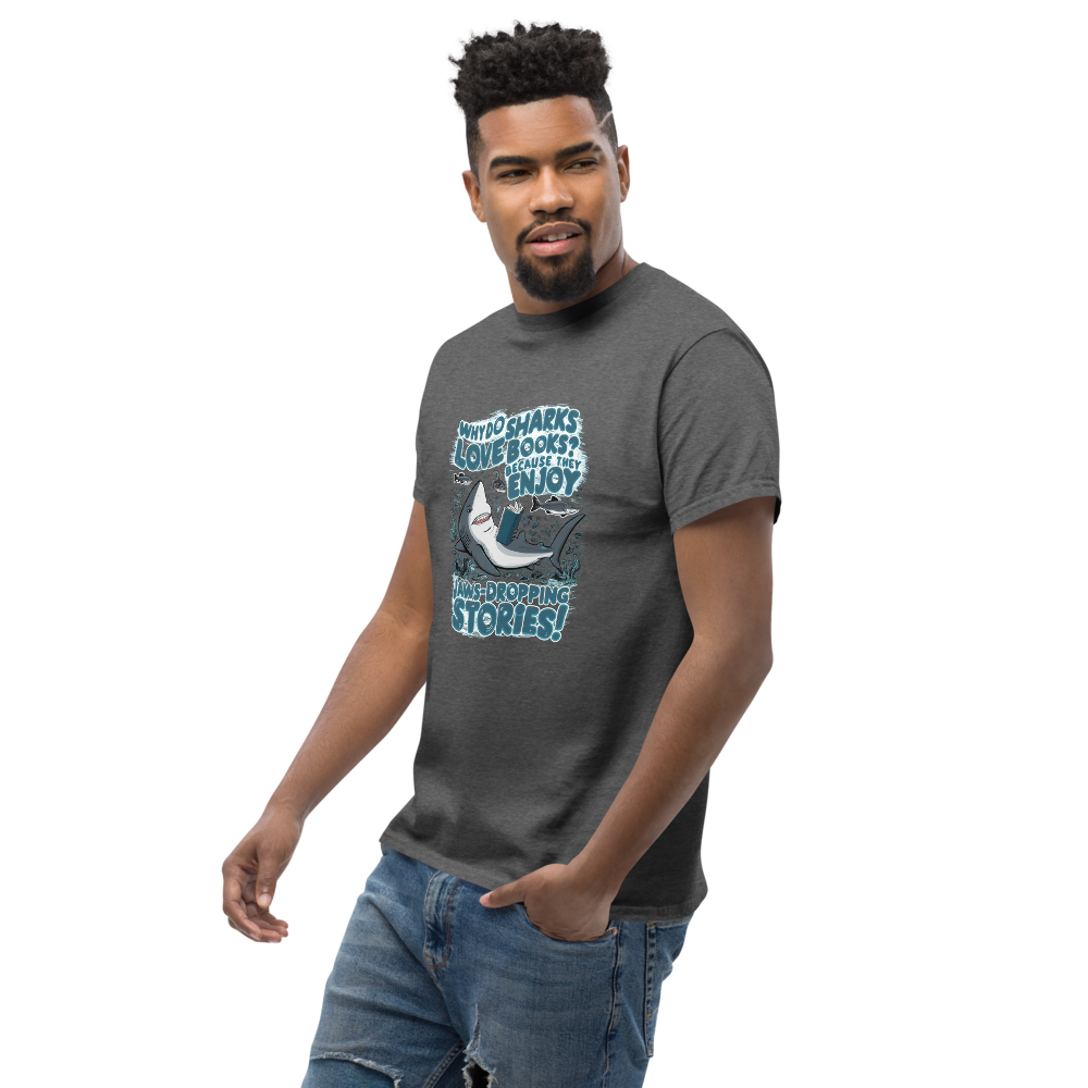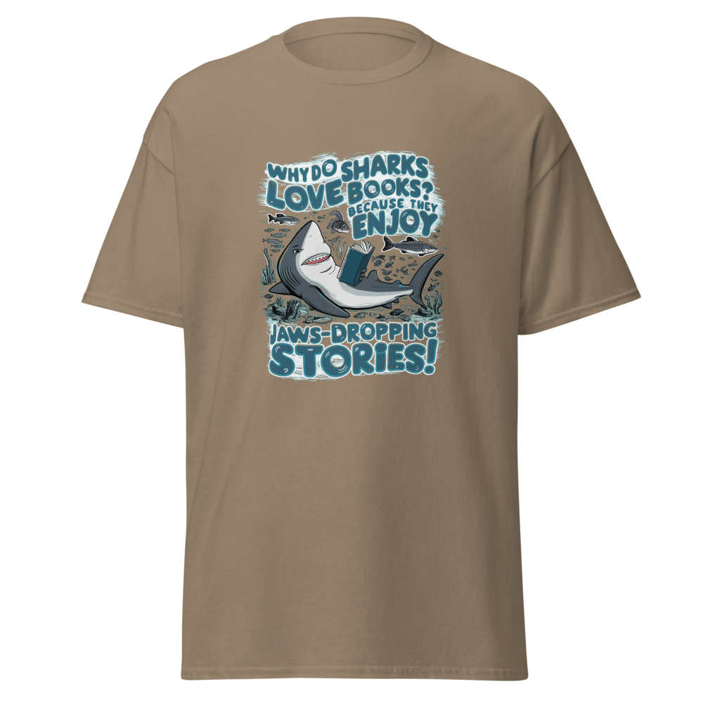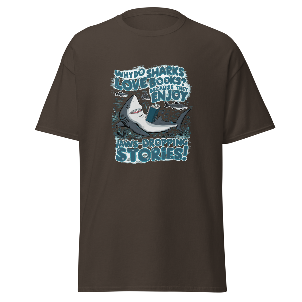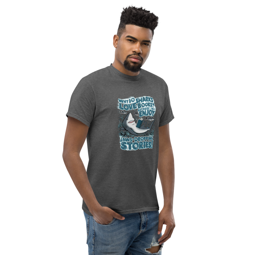Dive into a fun underwater adventure with this playful t-shirt featuring a shark reading a book, surrounded by fish and marine life illustrations. Perfect for kids and bookworms who love a good tale.This t-shirt is everything you’ve dreamed of and more. It feels soft and lightweight, with the right amount of stretch. It’s comfortable and flattering for all. 100% combed and ring-spun cotton (Heather colors contain polyester) Fabric weight: 4.2 oz./yd.² (142 g/m²) Pre-shrunk fabric Side-seamed construction Shoulder-to-shoulder taping
