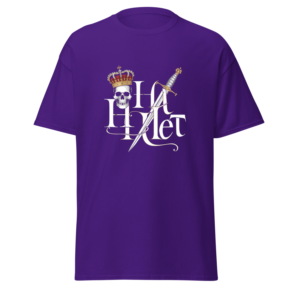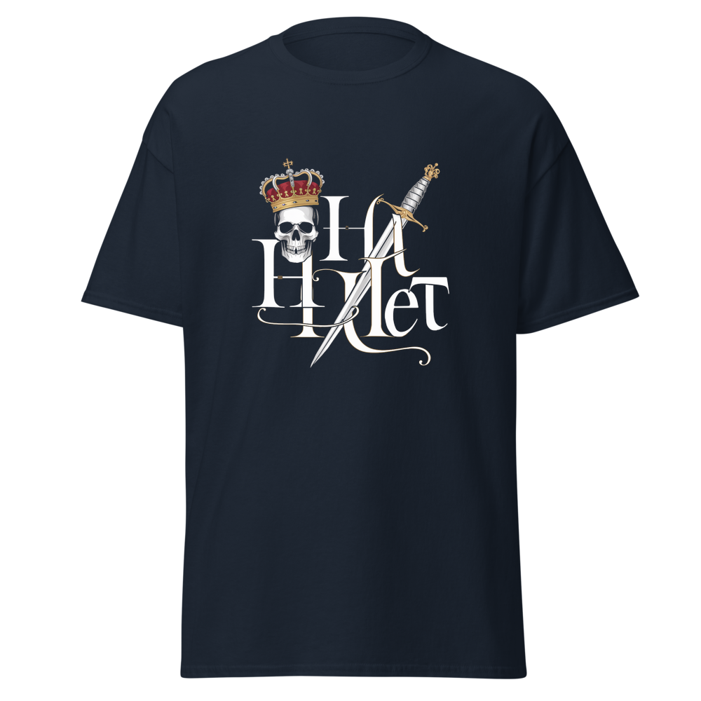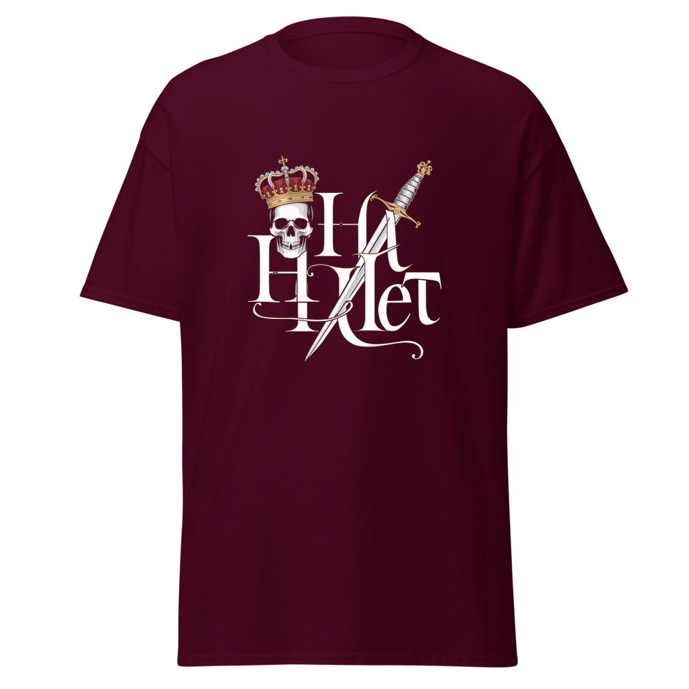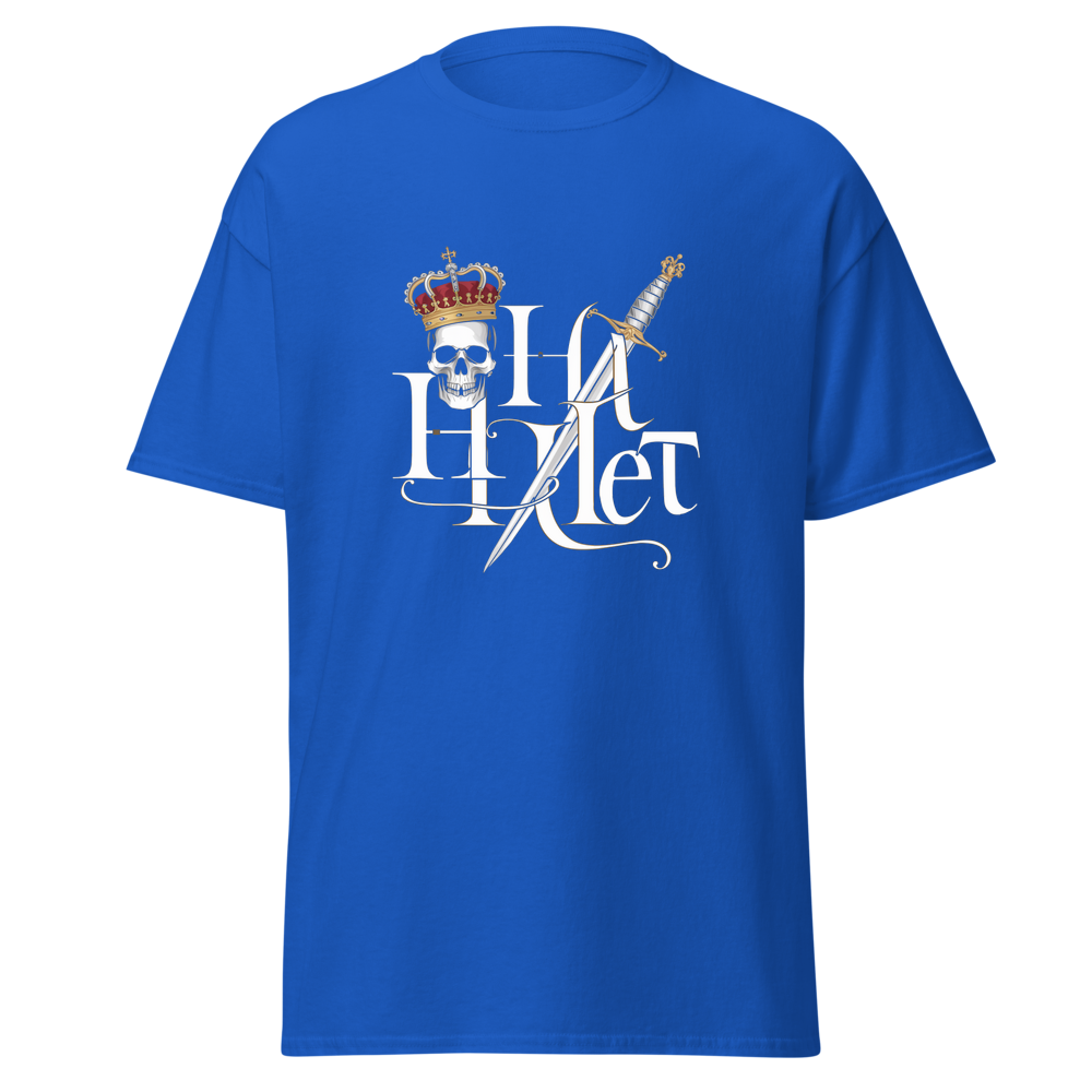 Embrace the timeless tale of drama and royalty with this striking design. A crowned skull paired with a dagger captures the essence of a tragic hero. Ideal for fans of classic literature and those with a taste for bold, iconic imagery.This t-shirt is everything you’ve dreamed of and more. It feels soft and lightweight, with the right amount of stretch. It’s comfortable and flattering for all. 100% combed and ring-spun cotton (Heather colors contain polyester) Fabric weight: 4.2 oz./yd.² (142 g/m²) Pre-shrunk fabric Side-seamed construction Shoulder-to-shoulder taping