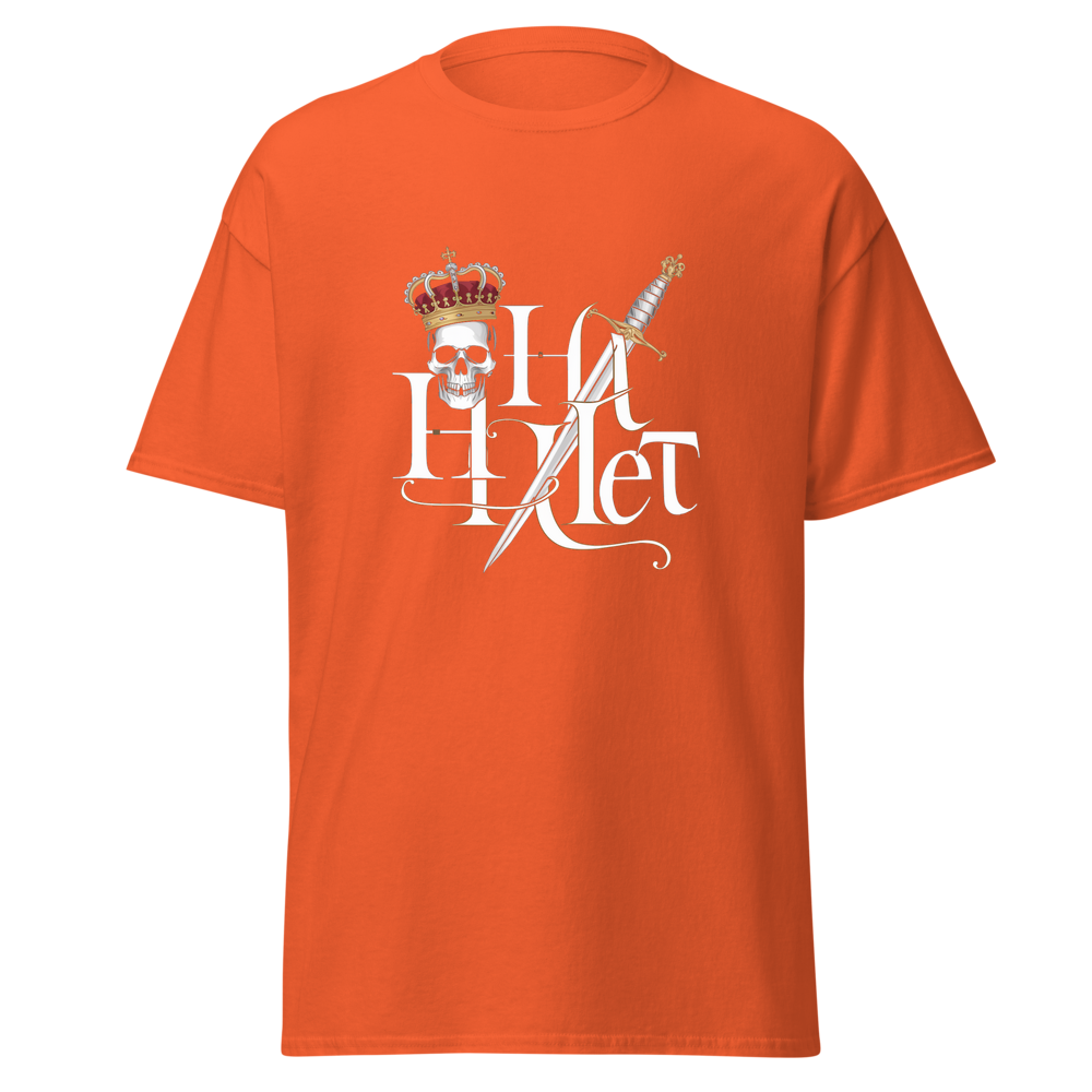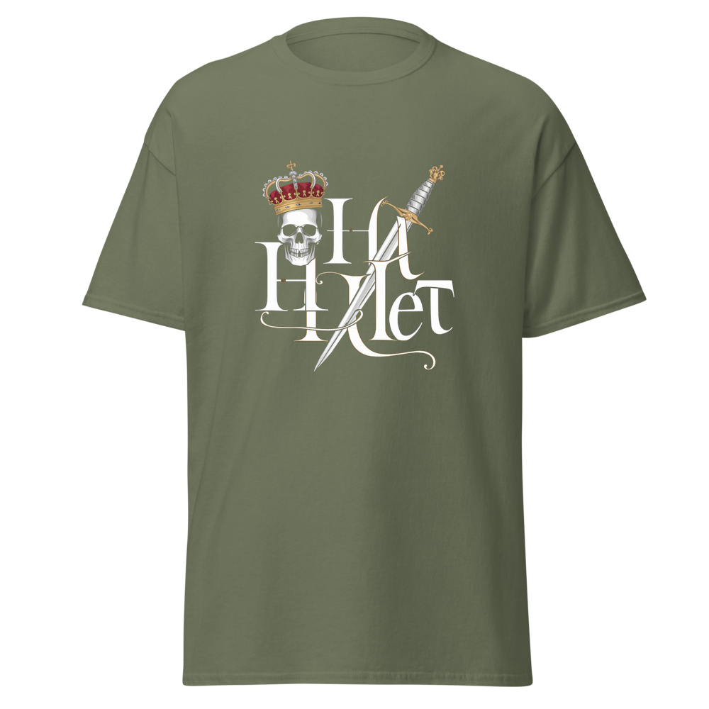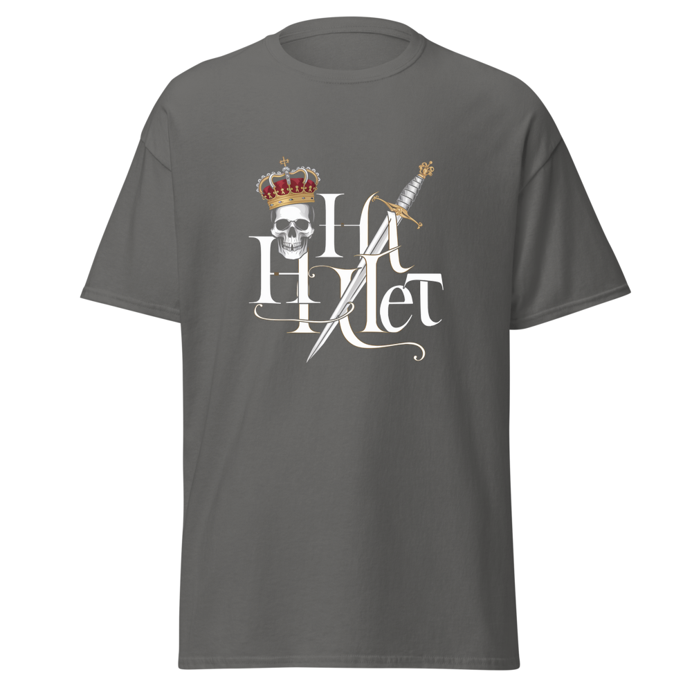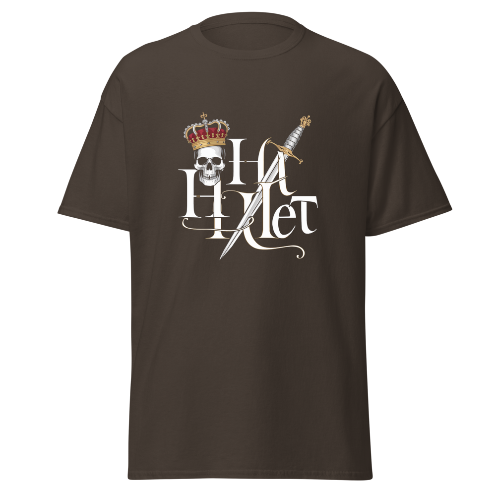 Embrace the timeless tale of drama and royalty with this striking design. A crowned skull paired with a dagger captures the essence of a tragic hero. Ideal for fans of classic literature and those with a taste for bold, iconic imagery.This t-shirt is everything you’ve dreamed of and more. It feels soft and lightweight, with the right amount of stretch. It’s comfortable and flattering for all. 100% combed and ring-spun cotton (Heather colors contain polyester) Fabric weight: 4.2 oz./yd.² (142 g/m²) Pre-shrunk fabric Side-seamed construction Shoulder-to-shoulder taping