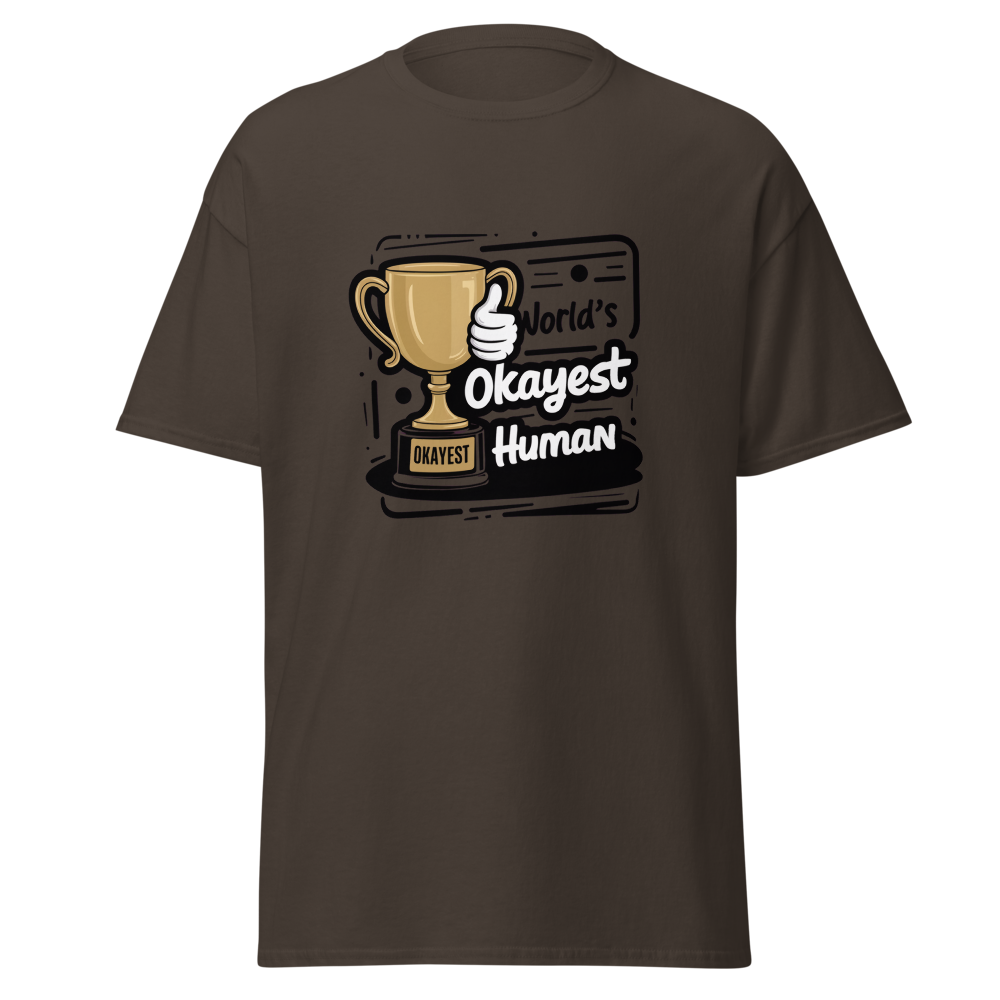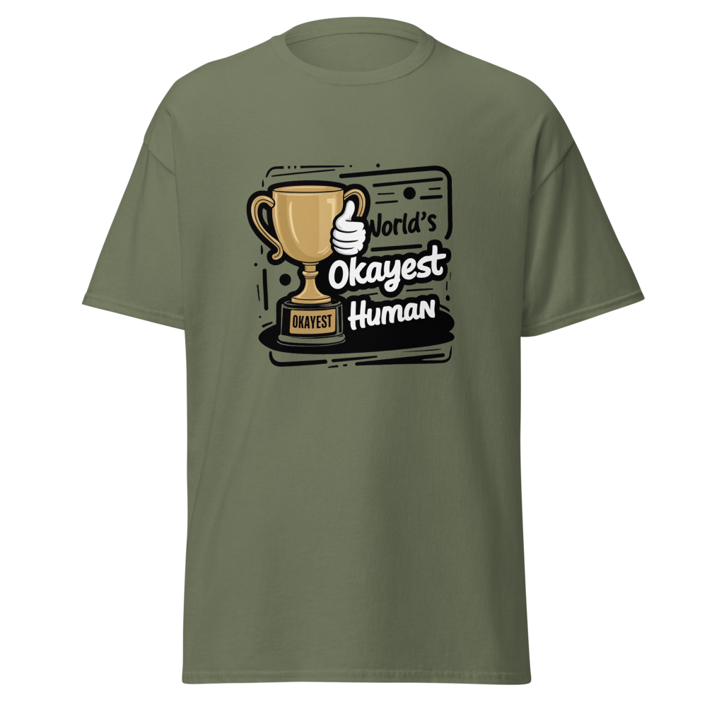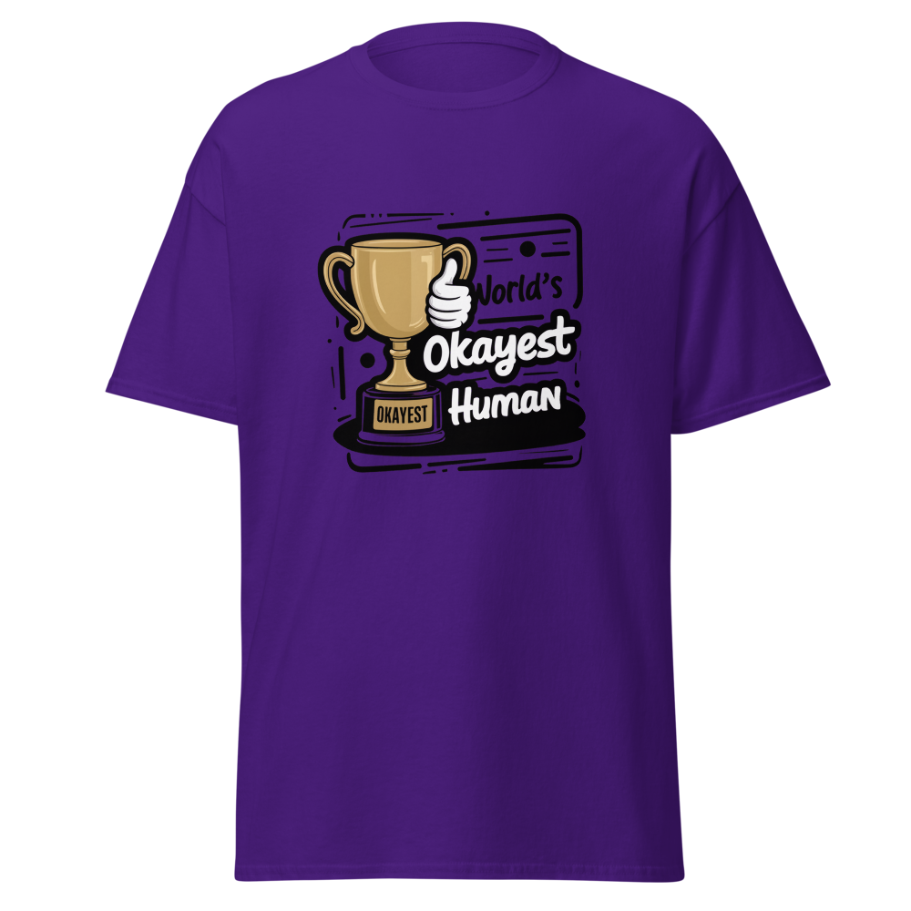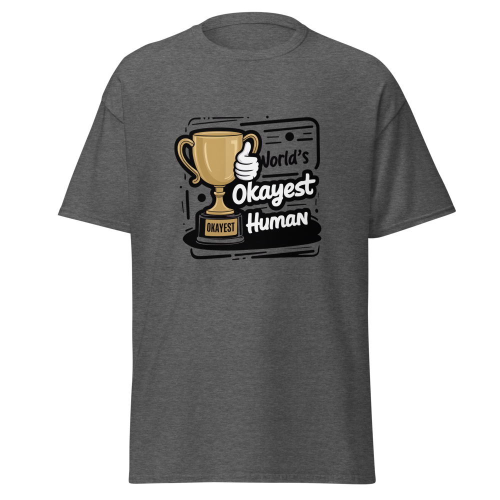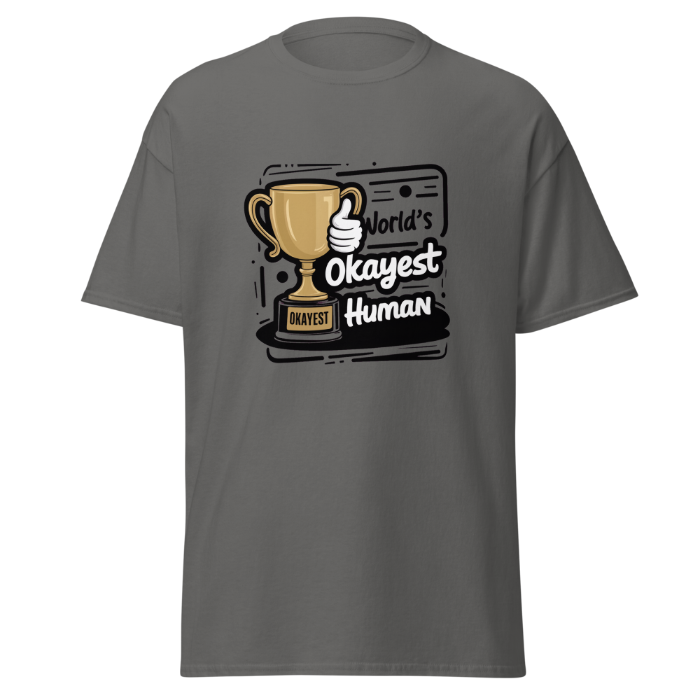 Celebrate the joy of being perfectly average with this fun t-shirt! Featuring a trophy with “Okayest” engraved on its base and a thumbs up, this design is perfect for those who embrace their quirks and sense of humor.This t-shirt is everything you’ve dreamed of and more. It feels soft and lightweight, with the right amount of stretch. It’s comfortable and flattering for all. 100% combed and ring-spun cotton (Heather colors contain polyester) Fabric weight: 4.2 oz./yd.² (142 g/m²) Pre-shrunk fabric Side-seamed construction Shoulder-to-shoulder taping