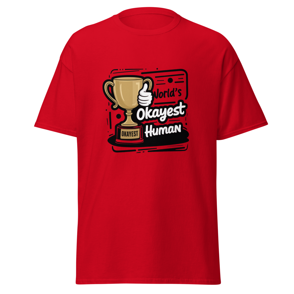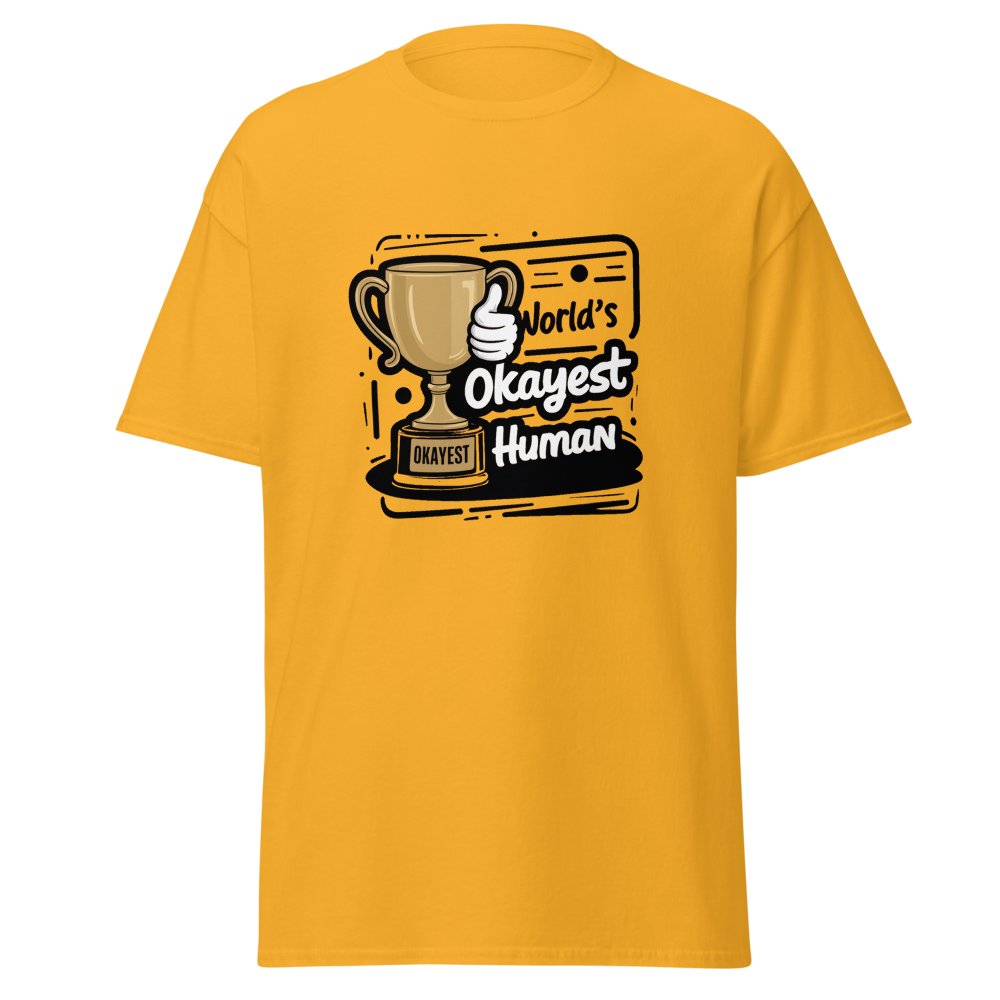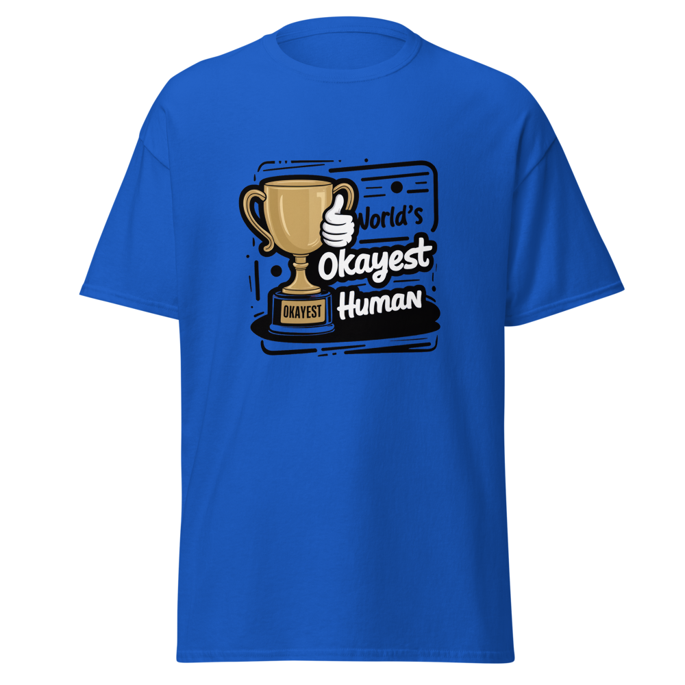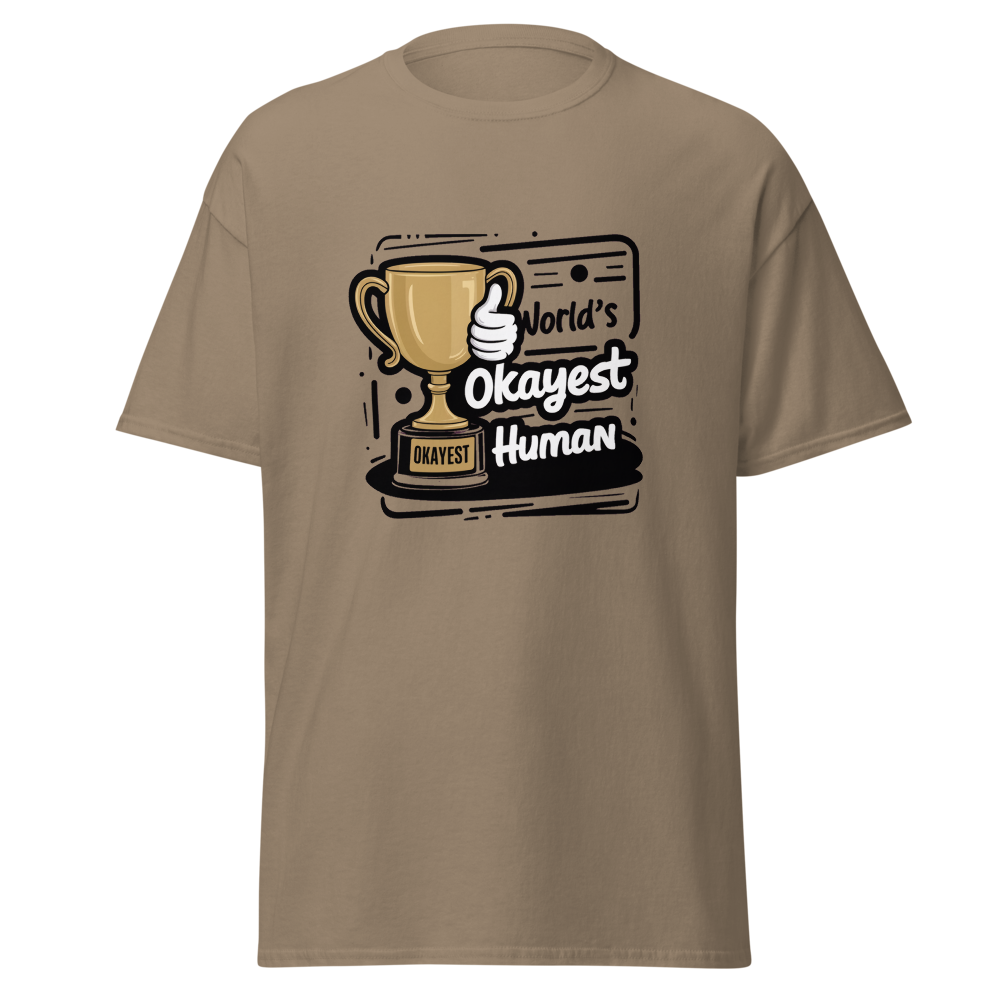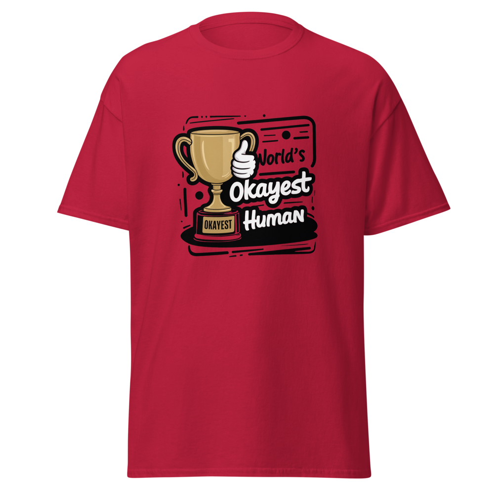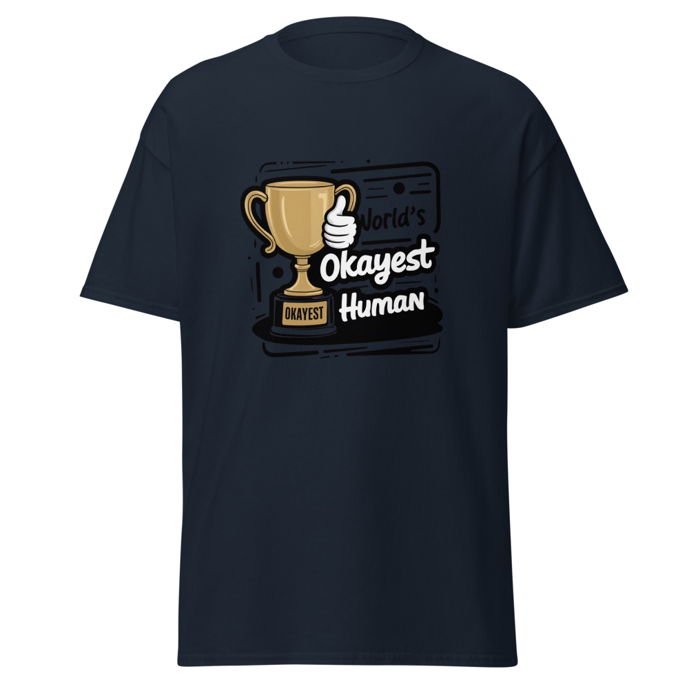 Celebrate the joy of being perfectly average with this fun t-shirt! Featuring a trophy with “Okayest” engraved on its base and a thumbs up, this design is perfect for those who embrace their quirks and sense of humor.This t-shirt is everything you’ve dreamed of and more. It feels soft and lightweight, with the right amount of stretch. It’s comfortable and flattering for all. 100% combed and ring-spun cotton (Heather colors contain polyester) Fabric weight: 4.2 oz./yd.² (142 g/m²) Pre-shrunk fabric Side-seamed construction Shoulder-to-shoulder taping