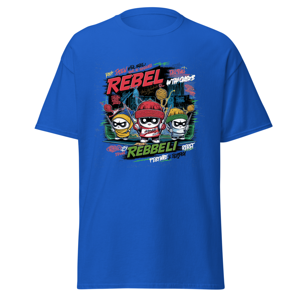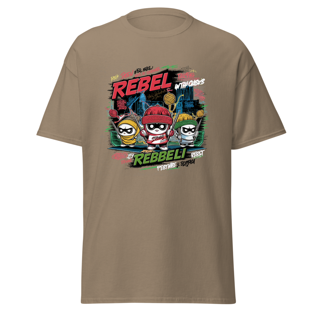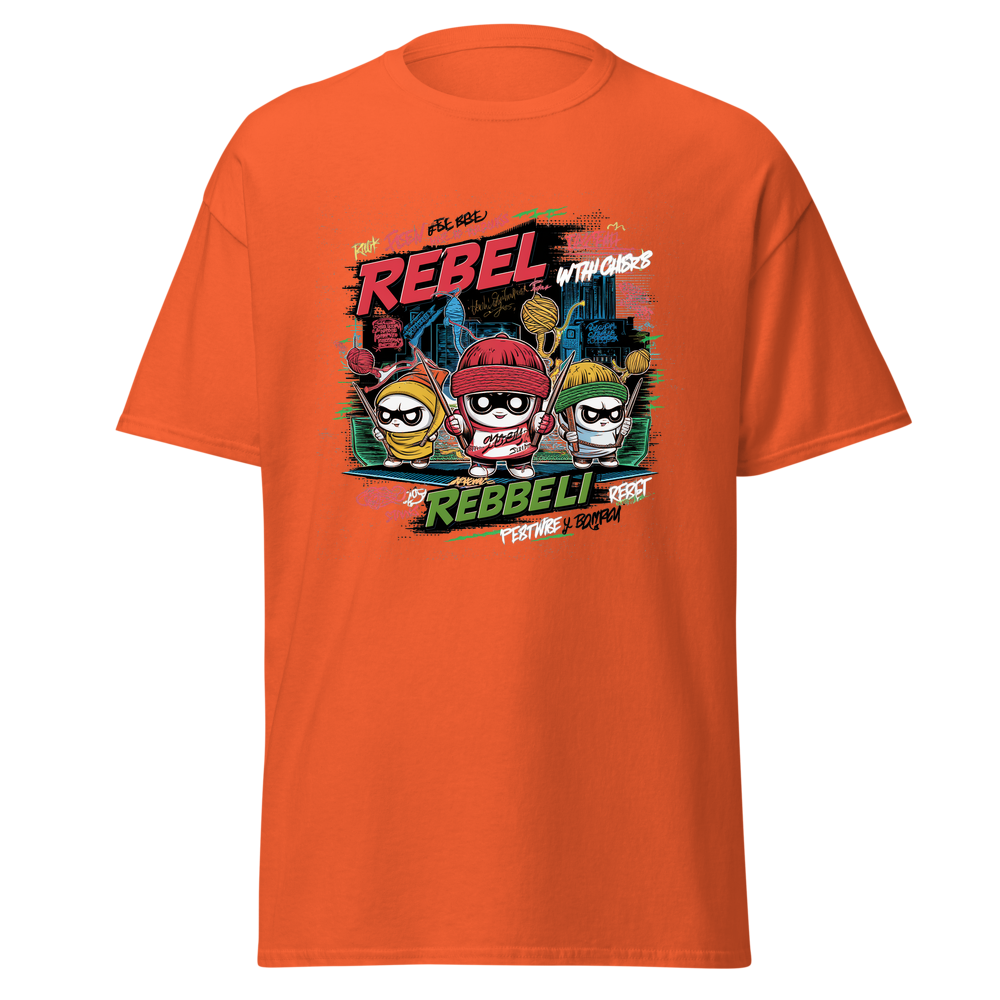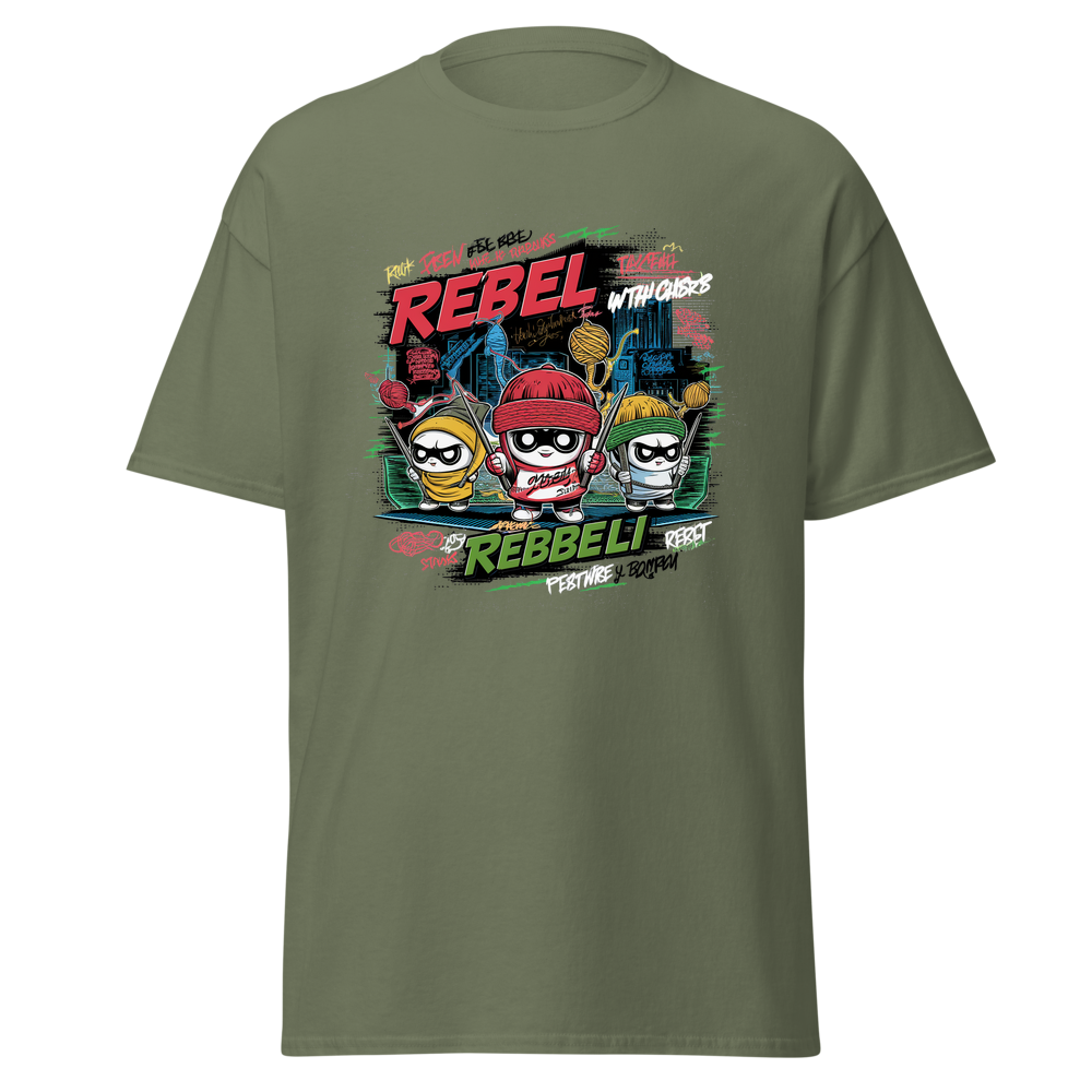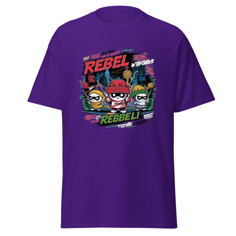 A playful design featuring adorable cartoon rebels armed with yarn bombs and knitting needles, ready to spark a woolly revolution. Set against a funky, graffiti-styled 90s urban backdrop, this shirt seamlessly blends nostalgia with crafty rebellion. Perfect for knitting and crocheting enthusiasts who love a touch of whimsy.This t-shirt is everything you’ve dreamed of and more. It feels soft and lightweight, with the right amount of stretch. It’s comfortable and flattering for all. 100% combed and ring-spun cotton (Heather colors contain polyester) Fabric weight: 4.2 oz./yd.² (142 g/m²) Pre-shrunk fabric Side-seamed construction Shoulder-to-shoulder taping