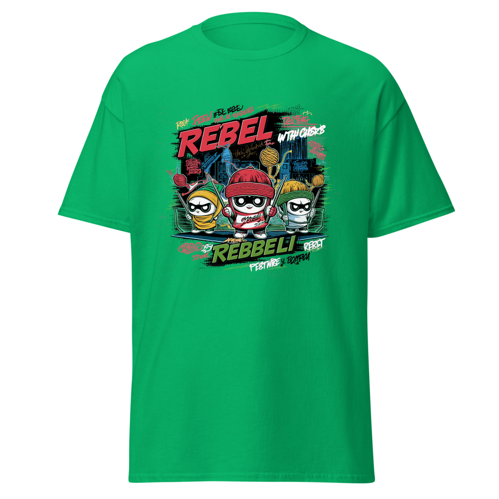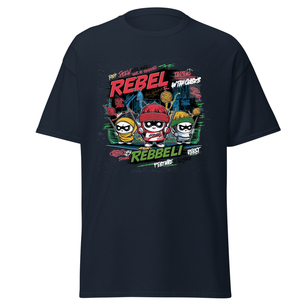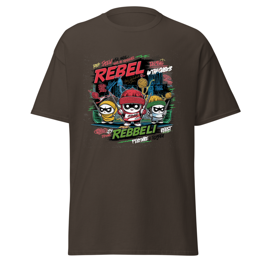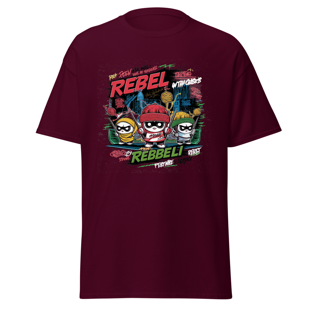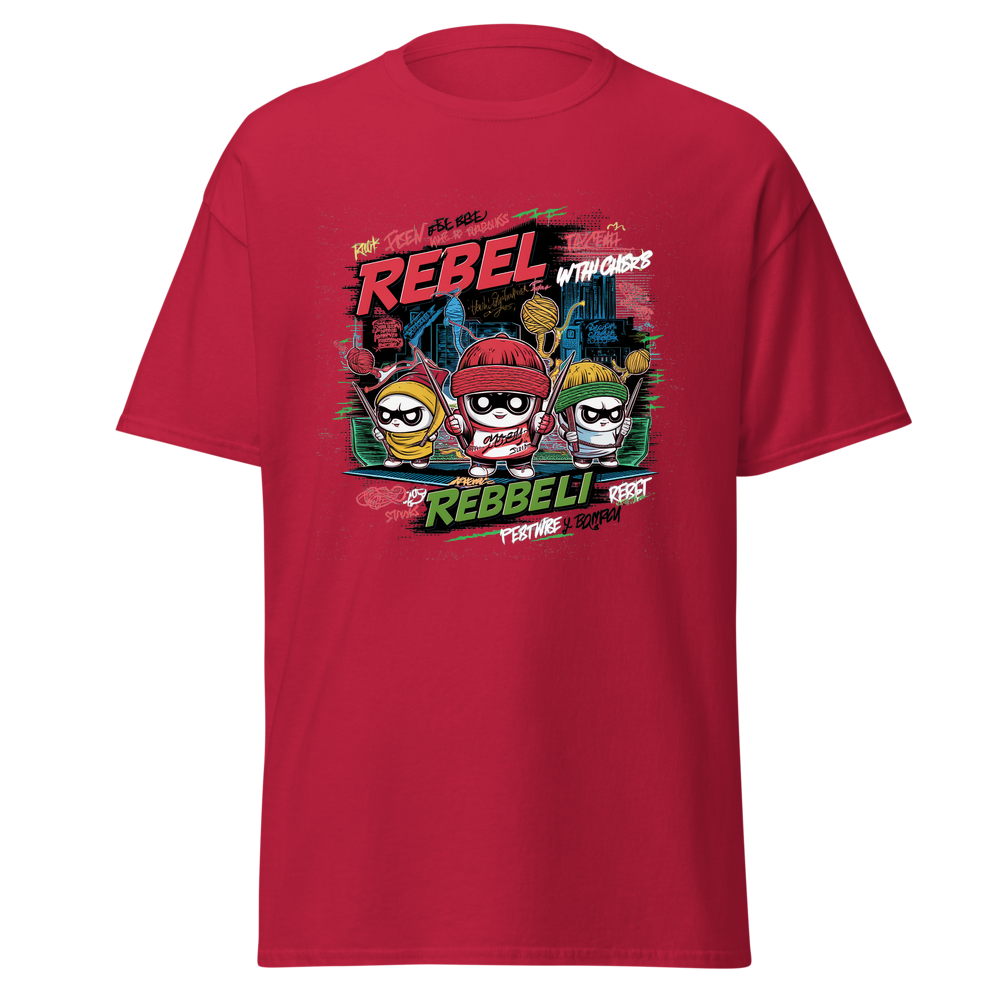 A playful design featuring adorable cartoon rebels armed with yarn bombs and knitting needles, ready to spark a woolly revolution. Set against a funky, graffiti-styled 90s urban backdrop, this shirt seamlessly blends nostalgia with crafty rebellion. Perfect for knitting and crocheting enthusiasts who love a touch of whimsy.This t-shirt is everything you’ve dreamed of and more. It feels soft and lightweight, with the right amount of stretch. It’s comfortable and flattering for all. 100% combed and ring-spun cotton (Heather colors contain polyester) Fabric weight: 4.2 oz./yd.² (142 g/m²) Pre-shrunk fabric Side-seamed construction Shoulder-to-shoulder taping